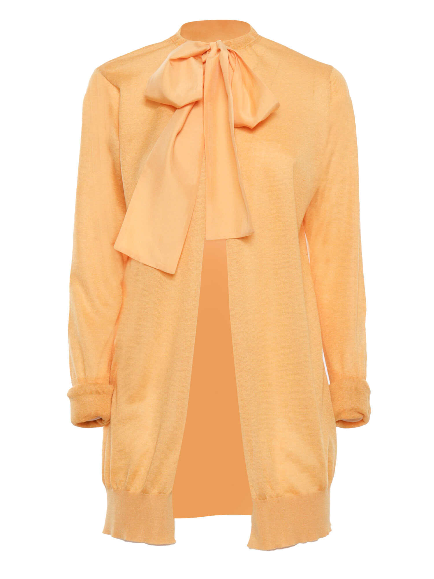 Orange cardigan with bow tie in linen and silk, pulled up sleeves with adjustable cuffs, high hem.