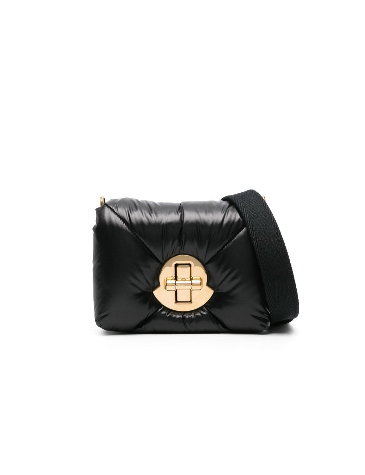 The Moncler Puf shoulder bag is made of quilted lacquered nylon and features a turn-lock closure in the shape of the brand's monogram. It has a flap, a water-repellent nylon lining, and an adjustable and removable strap made of ribbon. The metal accessories have a gold finish.