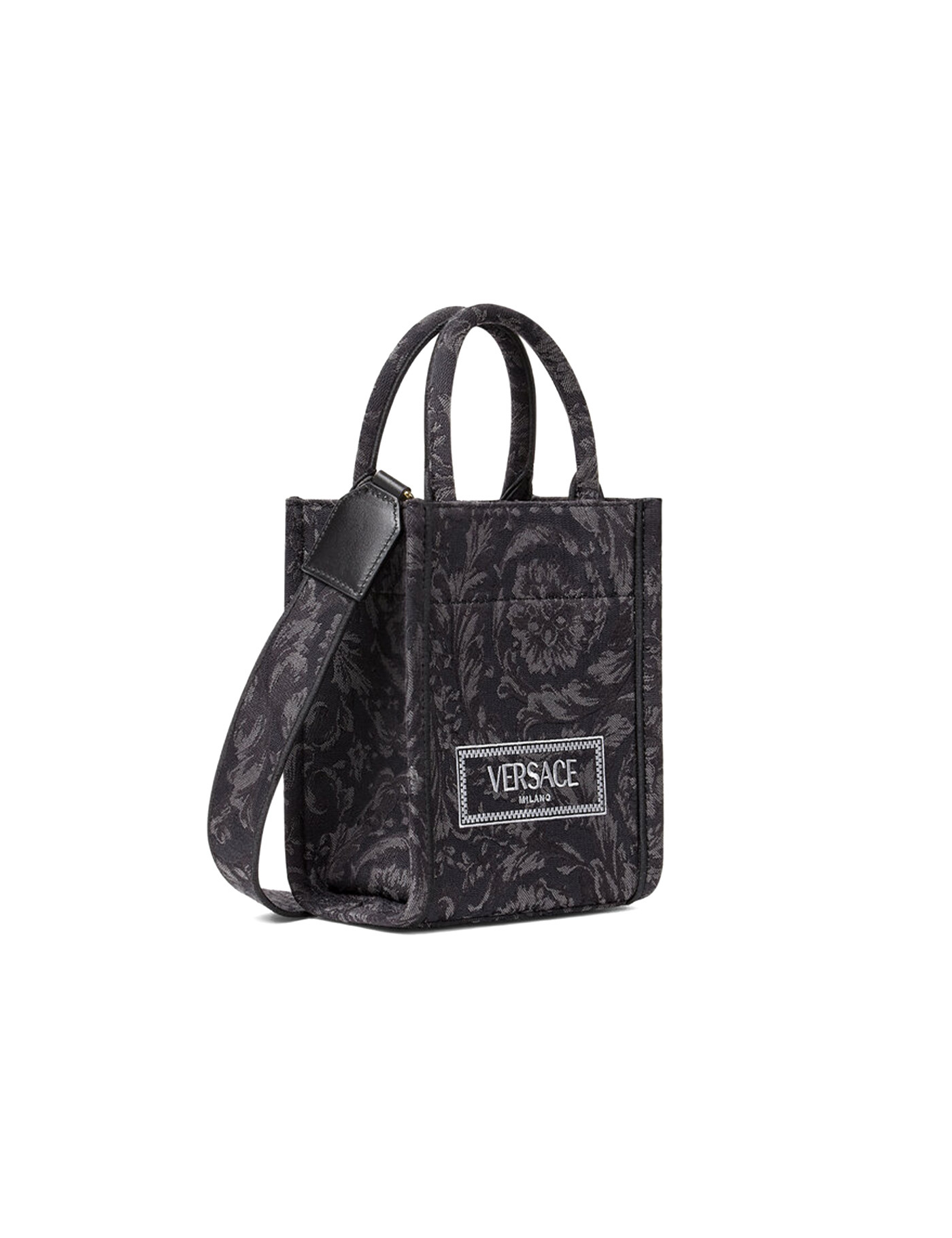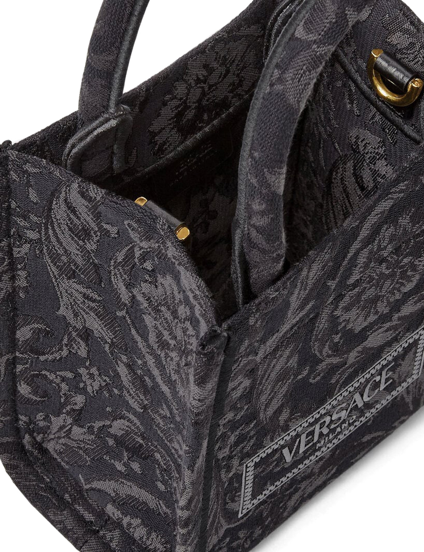 Athena Barocco tote bag by Versace made of jacquard Barocco cotton-blend canvas with contrasting '90s Vintage Logo embroidery. Double handles, lined interior with one zippered pocket and adjustable, detachable shoulder strap. Gold-finished metalware.