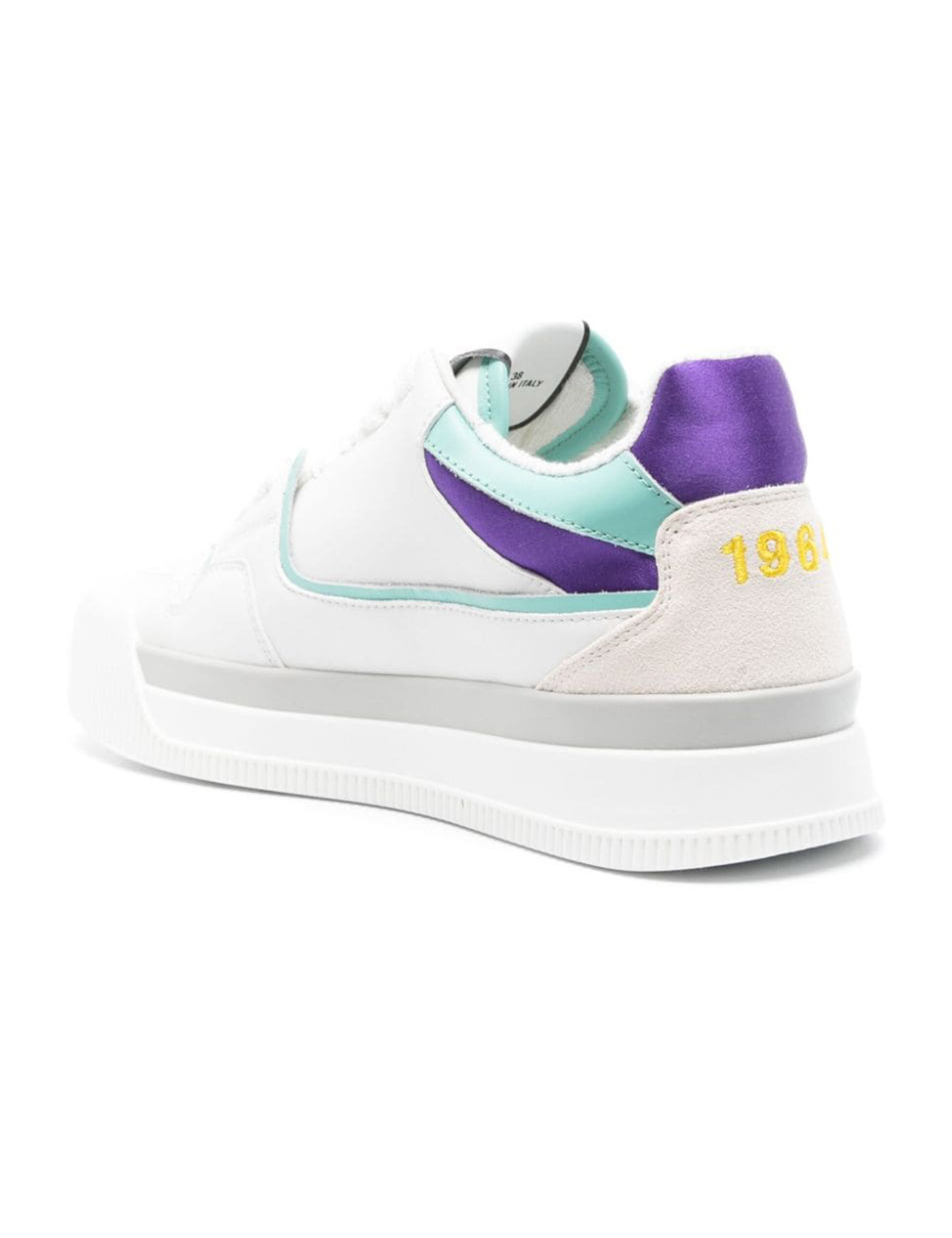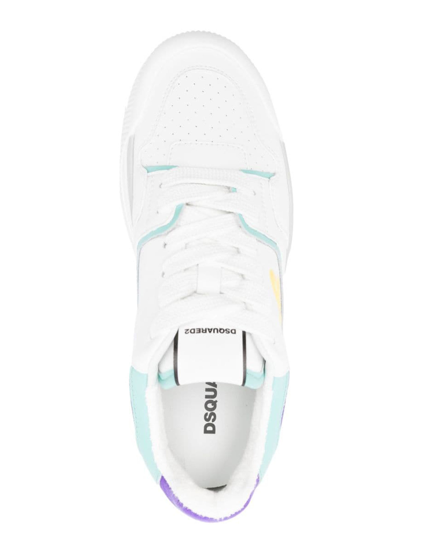 The Dsquared2 New Jersey sneakers are made of smooth leather with contrasting details and inserts in satin and suede. They feature a side D2 print and 1984 embroidery on the heel, perforated toe, logo patch on the tongue, sponge lining, and removable leather insole. The rubber sole has a contrasting logo insert.