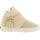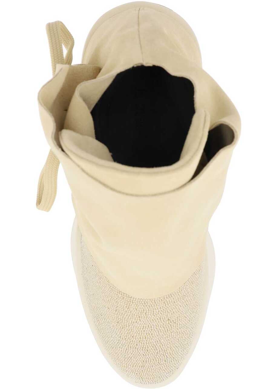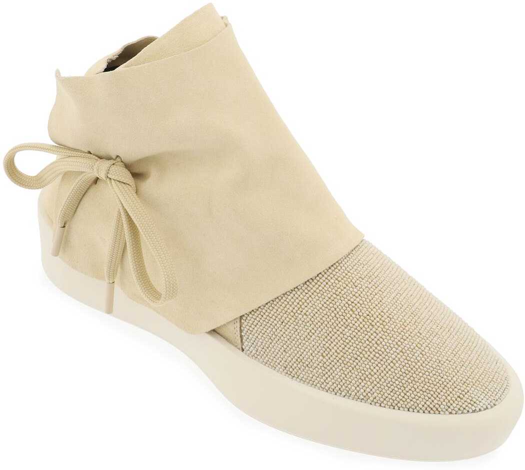 These mid-top Fear Of God sneakers are made of soft suede leather and feature a beaded design on the front, inspired by Native American moccasins. They have a side closure with laces, a fabric interior with a removable insole, and a rubber sole with a contrasting embossed logo patch on the back.