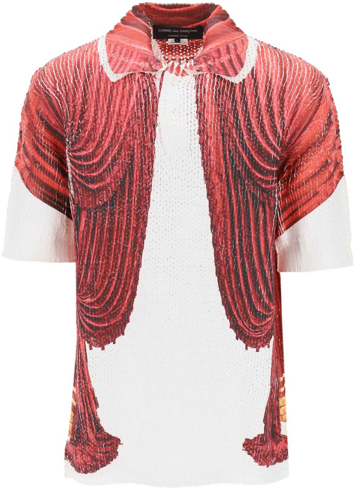 This T-shirt from the Homme Plus collection by Comme Des Garçons is made of compact technical fabric with a theatrical-inspired print. It features a spread collar with partial button closure and has a relaxed fit with a straight cut. The model is 187 cm tall and wears a size L.