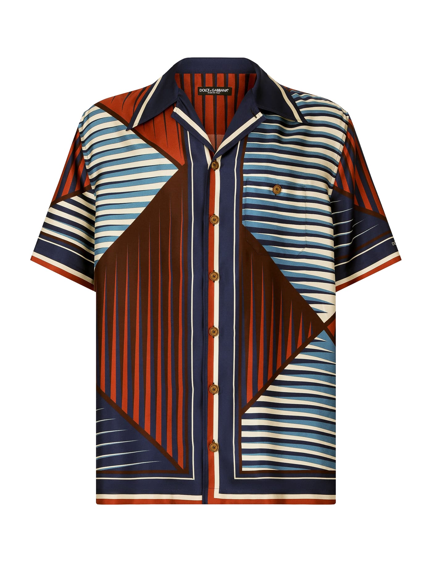 This Dolce&Gabbana shirt is made of pure silk twill with an all-over geometric pattern. It features a Cuban collar, French button placket, a patch pocket with button on the chest, and side slits with mouche at the bottom. The relaxed fit is enhanced by the boxy cut and highlighted by the back yoke with side pleats. The model is 187 cm tall and wears a size 40.