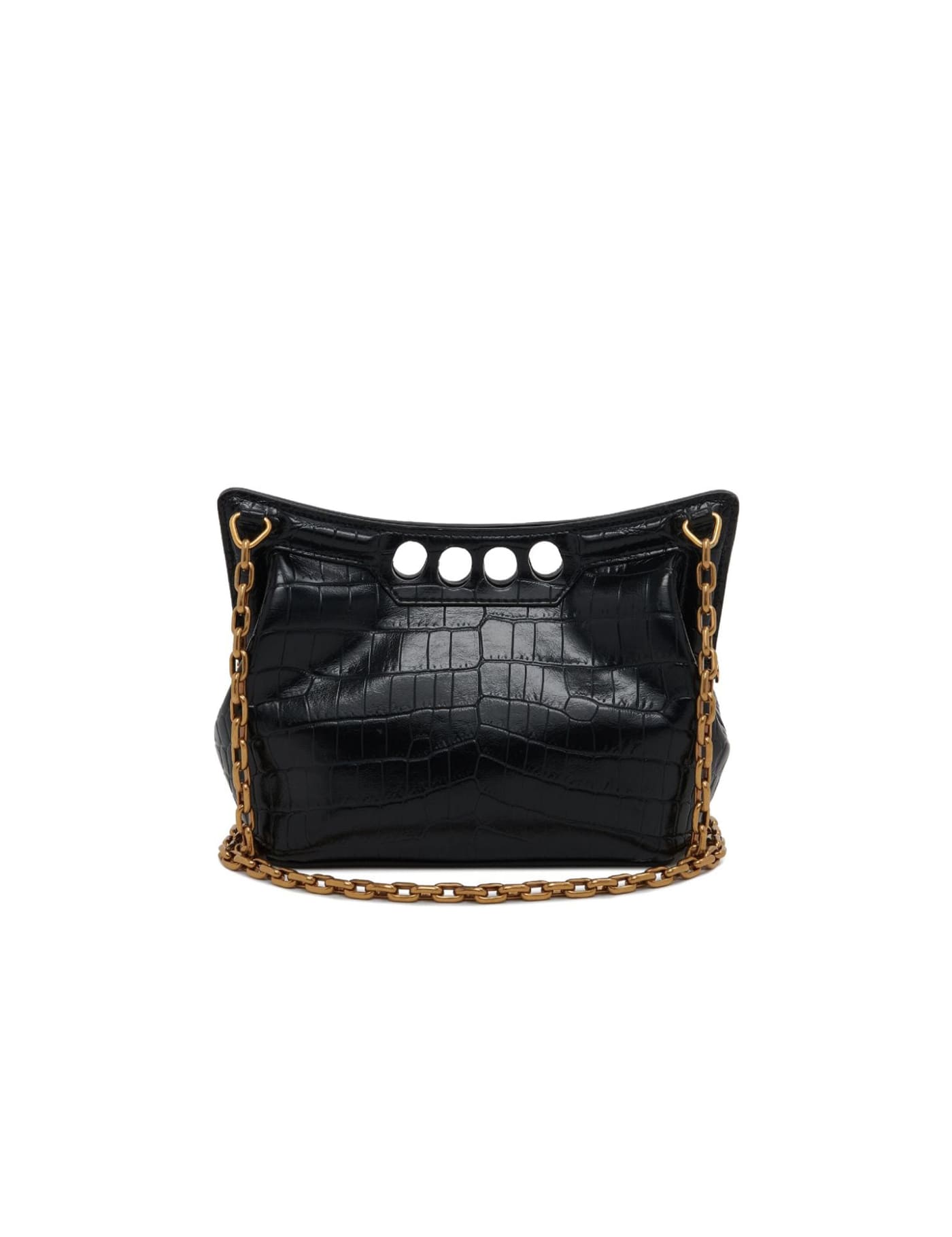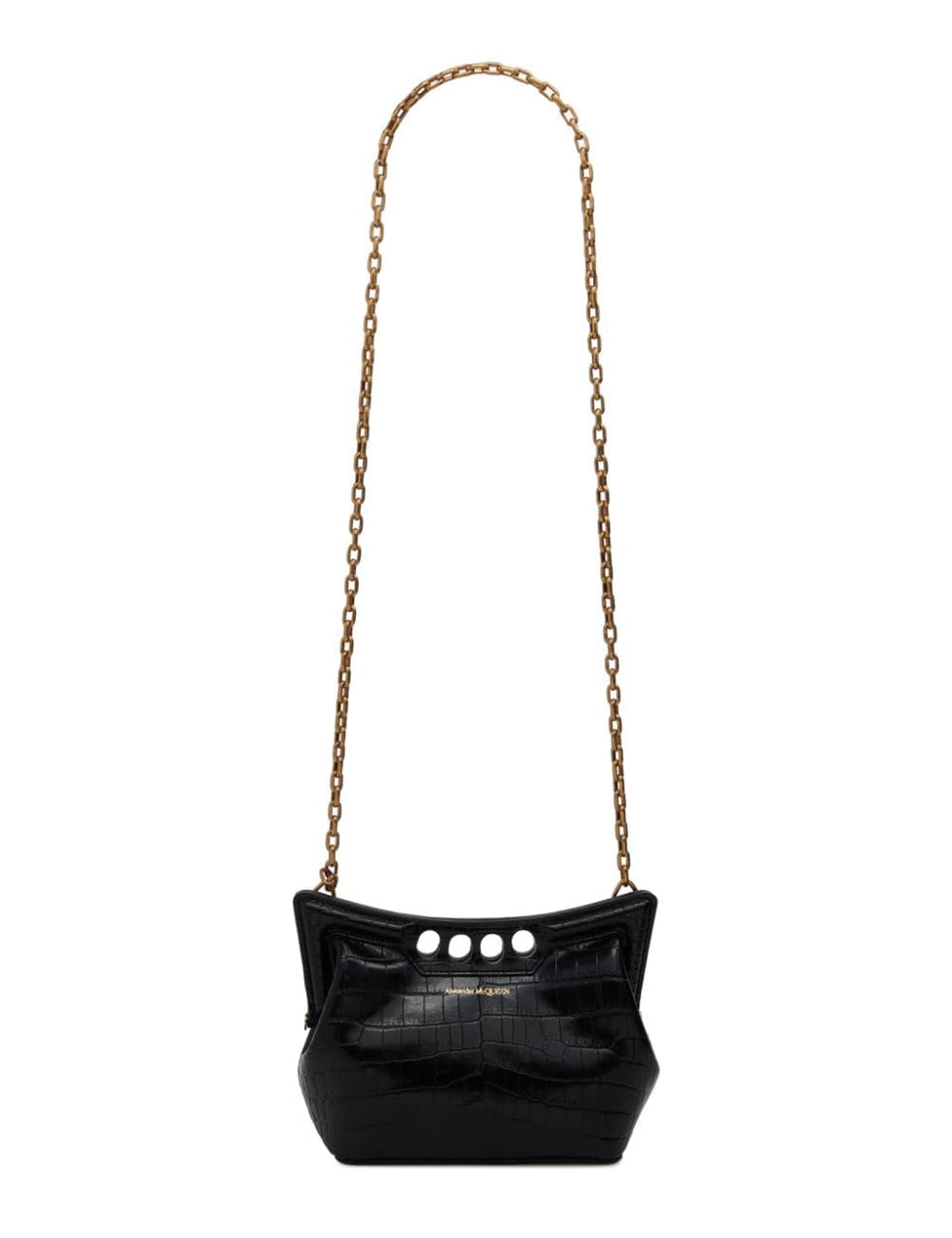 black embossed crocodile effect logo stamp to the front signature Four Ring handle chain-link shoulder strap magnetic fastening main compartment gold-tone hardware