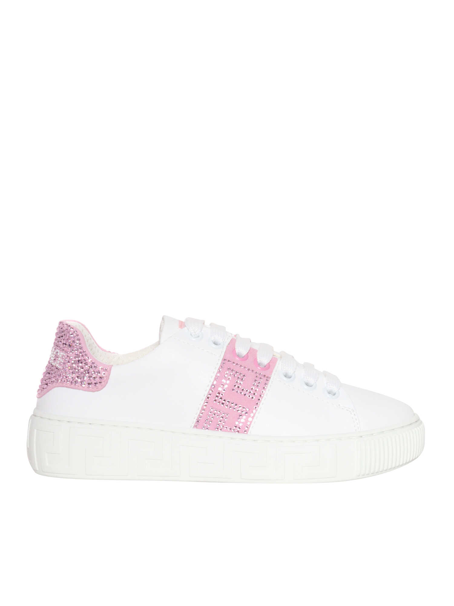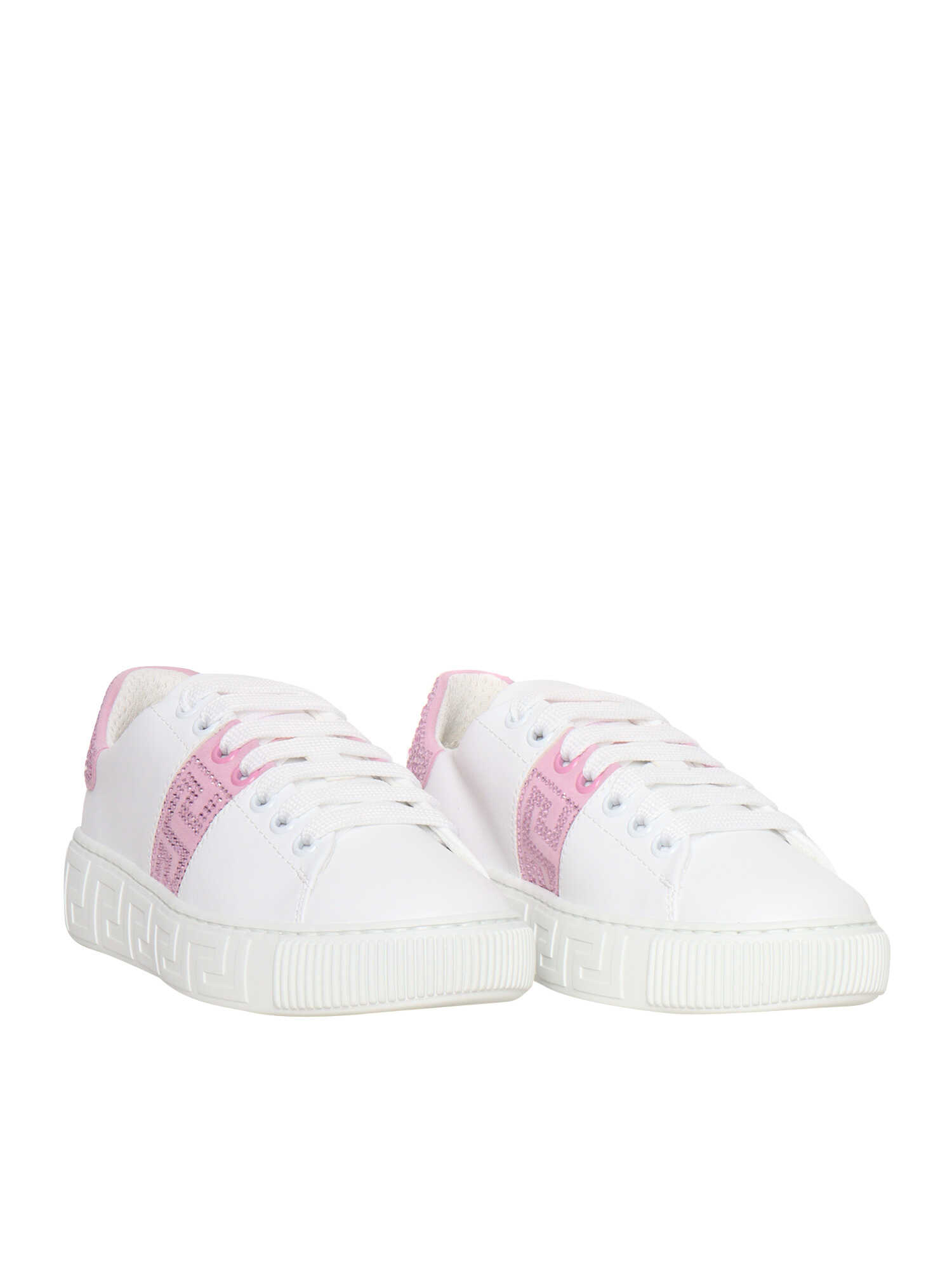 Versace girls' sneakers in calfskin with high sole, grec pink details, rags, tone-on-tone laces.