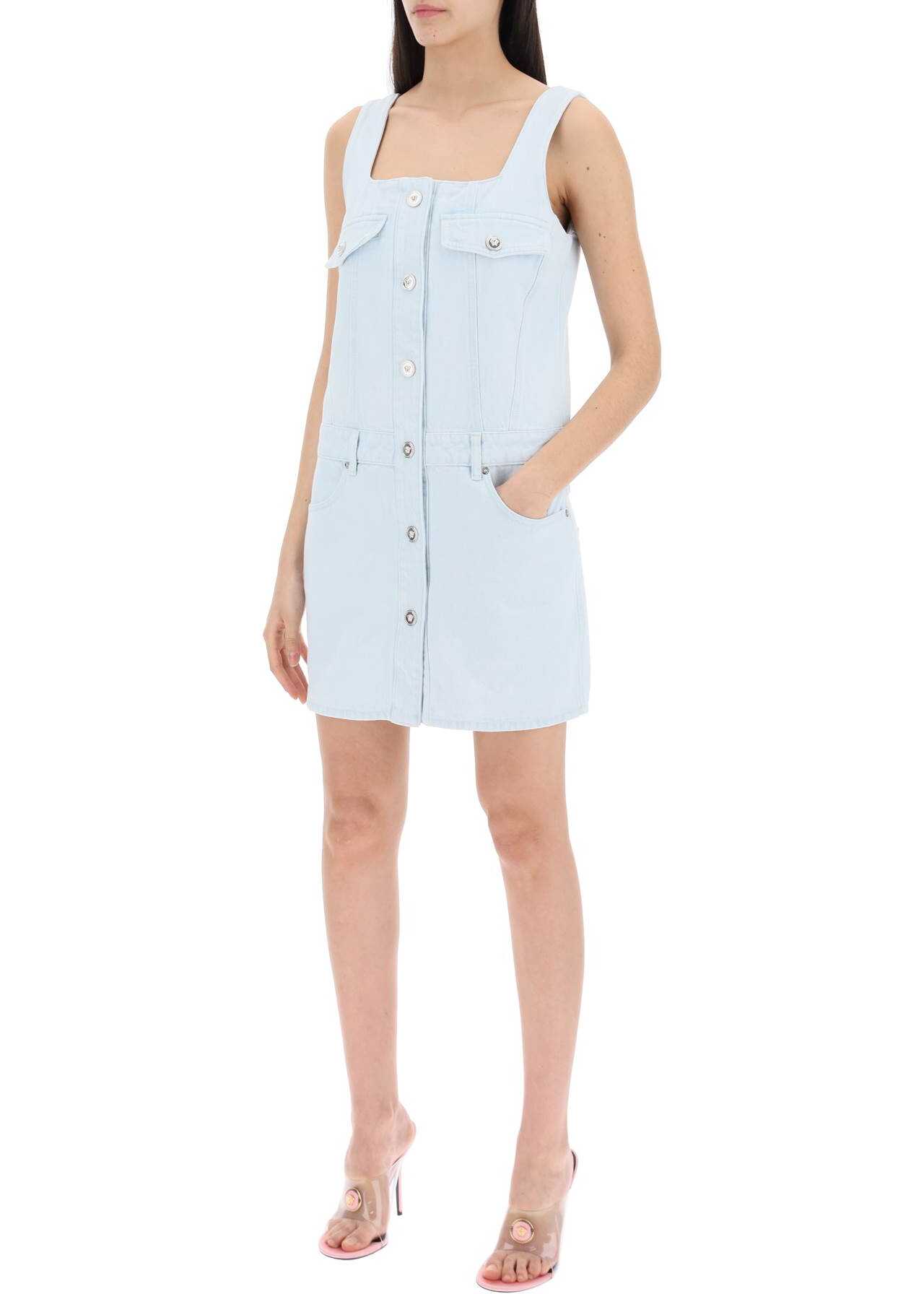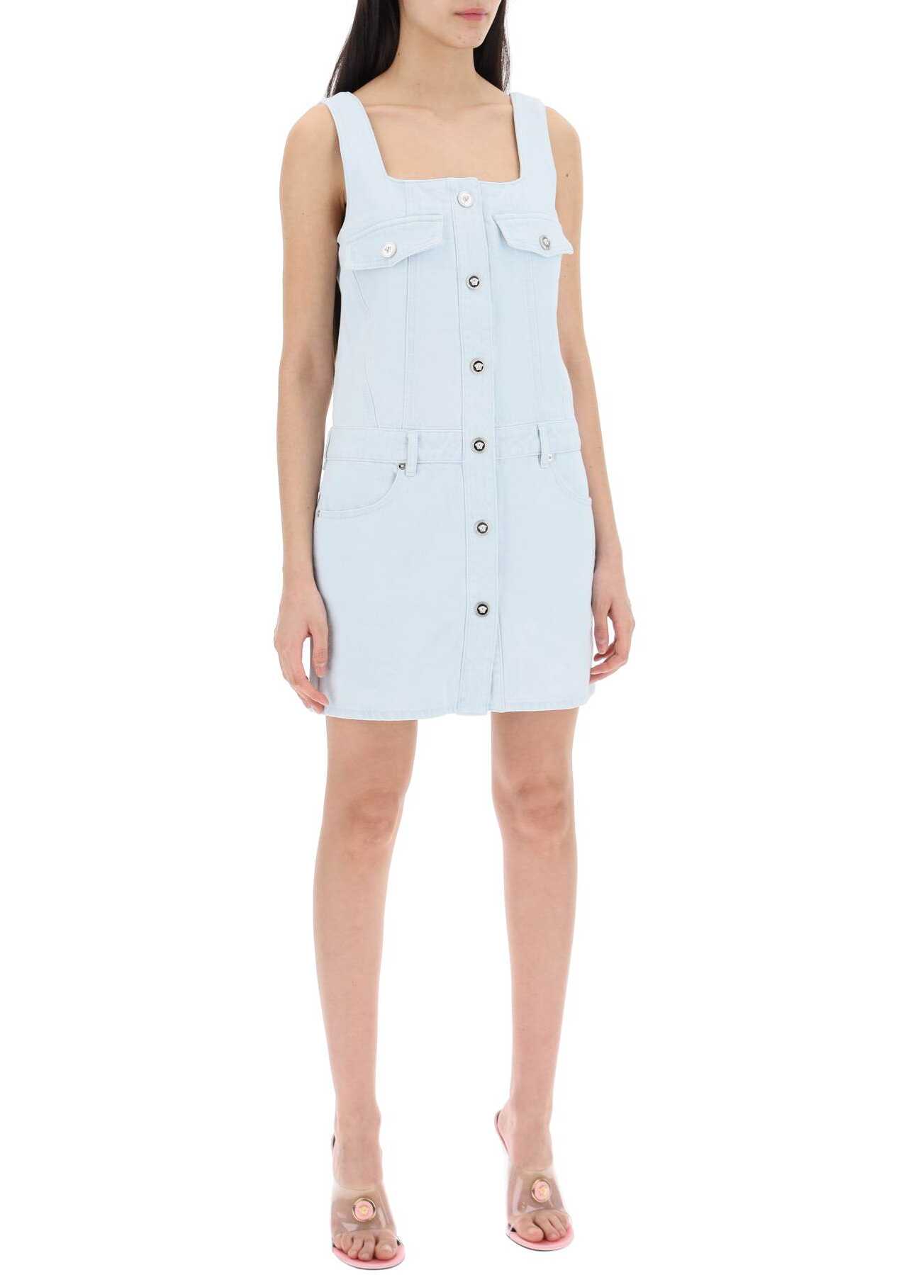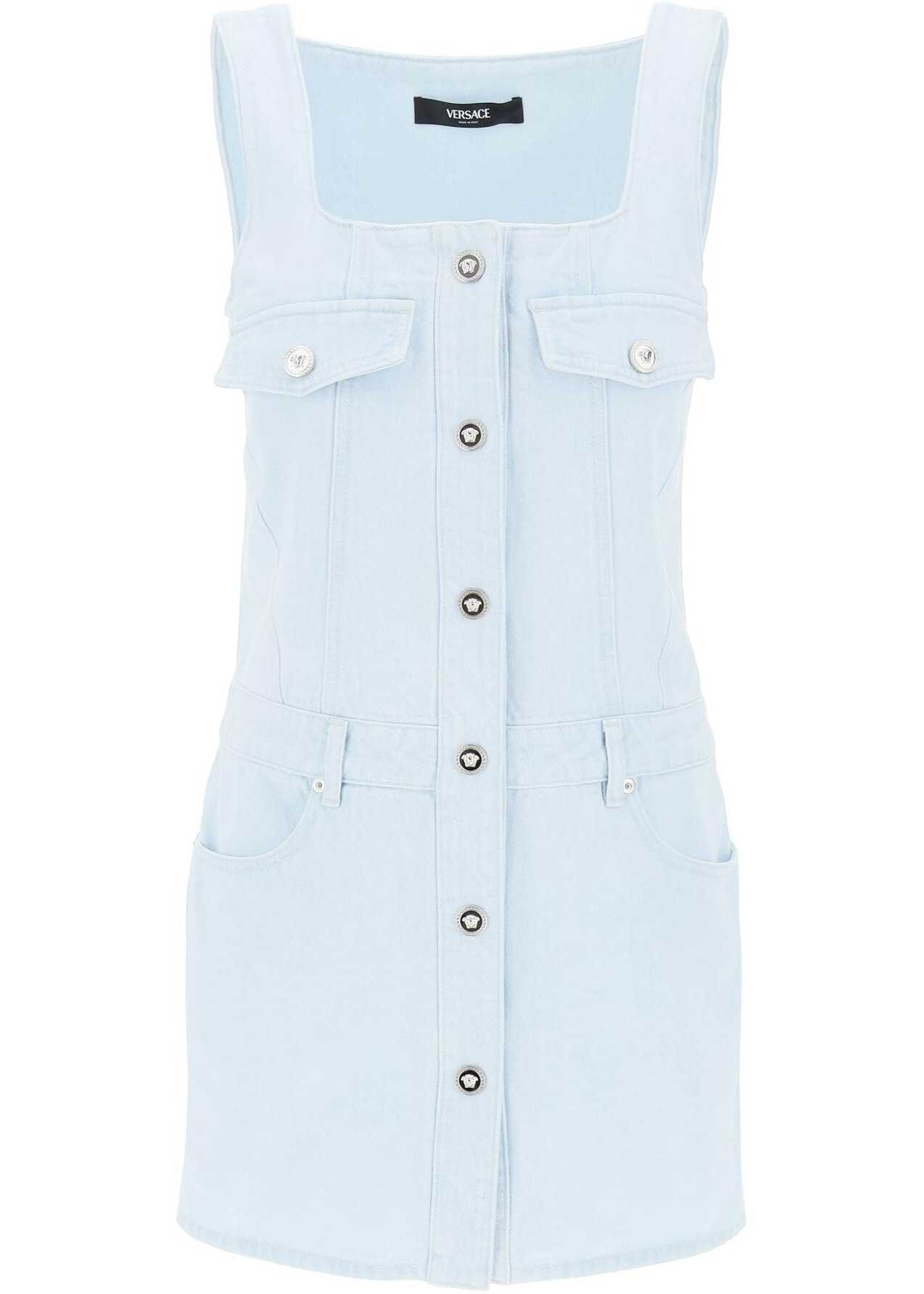 This Versace mini dress is made of stone-washed cotton denim. The sleeveless design features a rectangular neckline and is equipped with flap pockets on the chest, two pockets on the hips, two additional pockets on the back, and belt loops. Adorned with silver-tone Medusa buttons. Slim fit. Model is 177 cm tall and wears size IT 40.