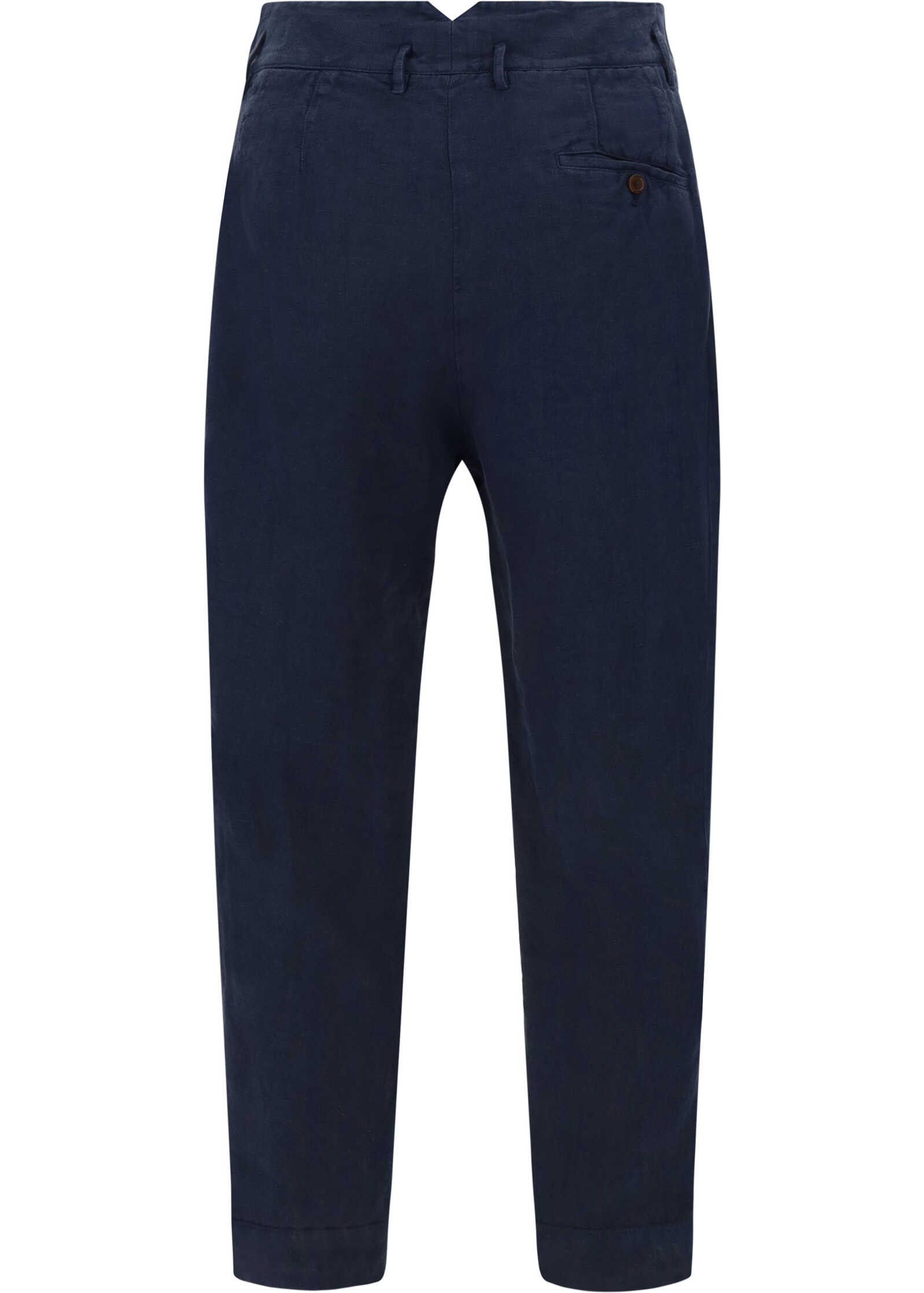 Linen Pants by Vivienne Westwood, front button and zipper closure, two side slash pockets, back welt pocket, waistband loops, monochrome pattern, regular fit.