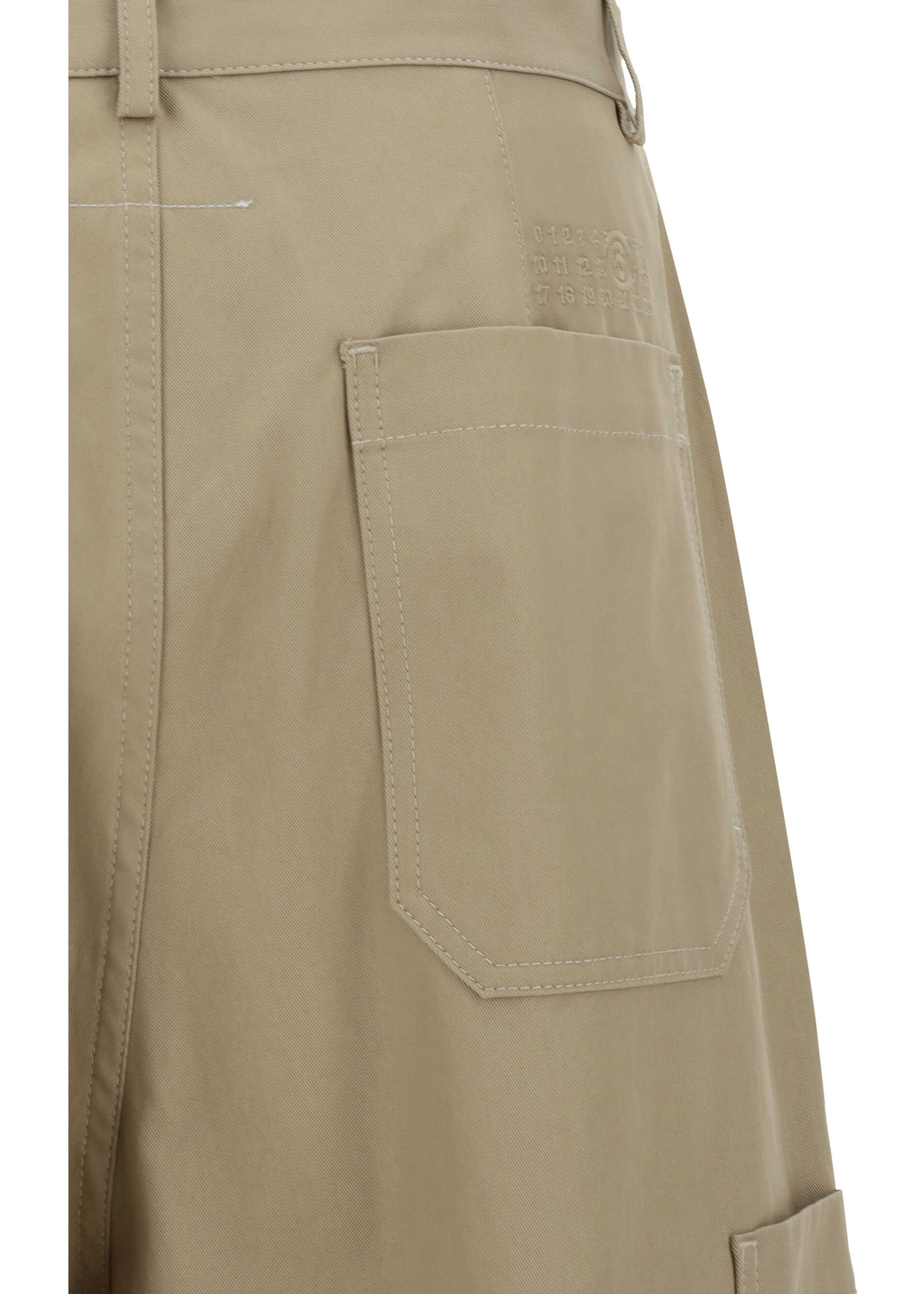 Cotton Pants by MM6, baggy style, front button closure, two side slash pockets, two welt pockets on back, waistband loops, iconic brand logo embroidered on back panel, worker pocket on side panel, monochrome pattern, oversize fit.