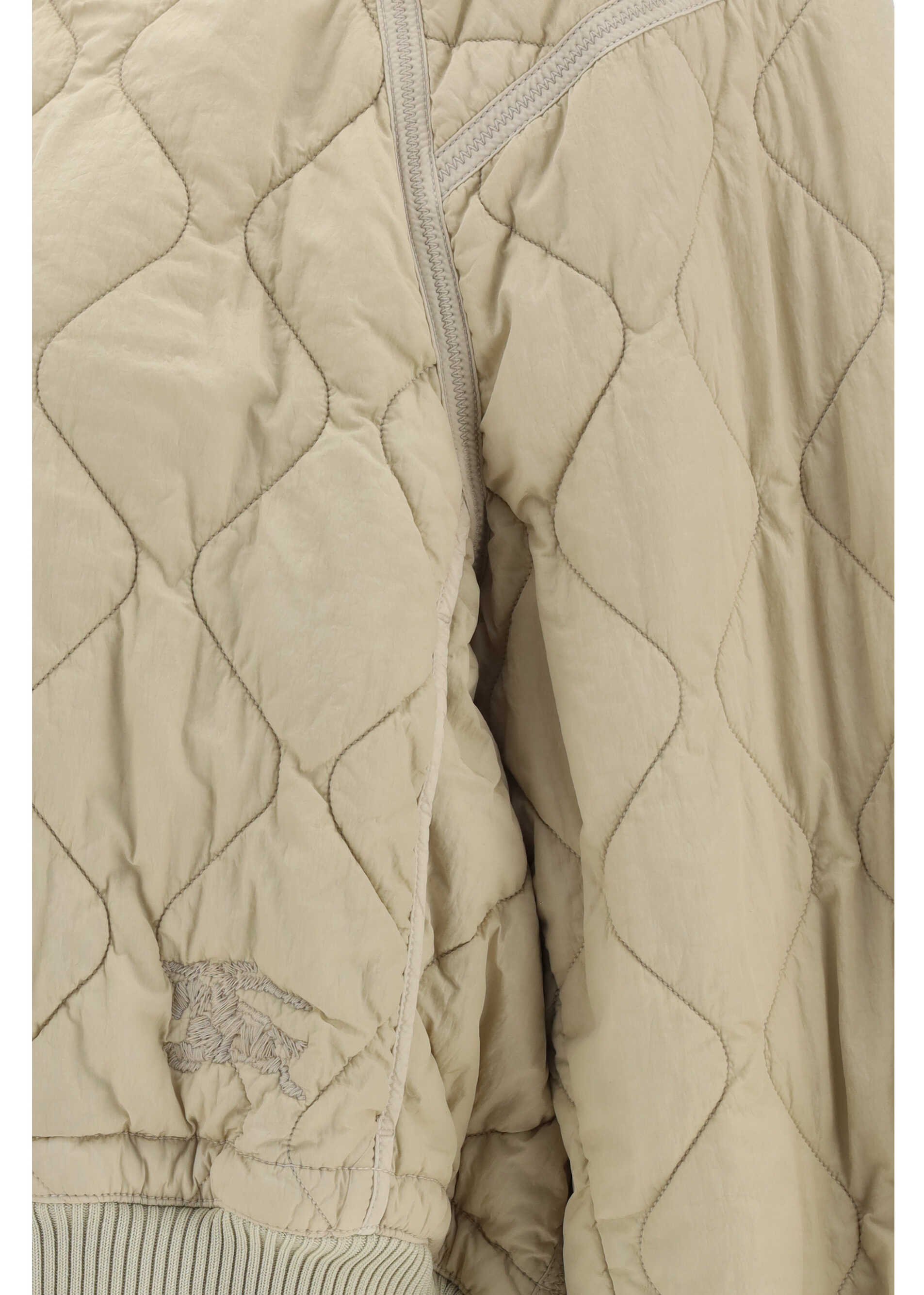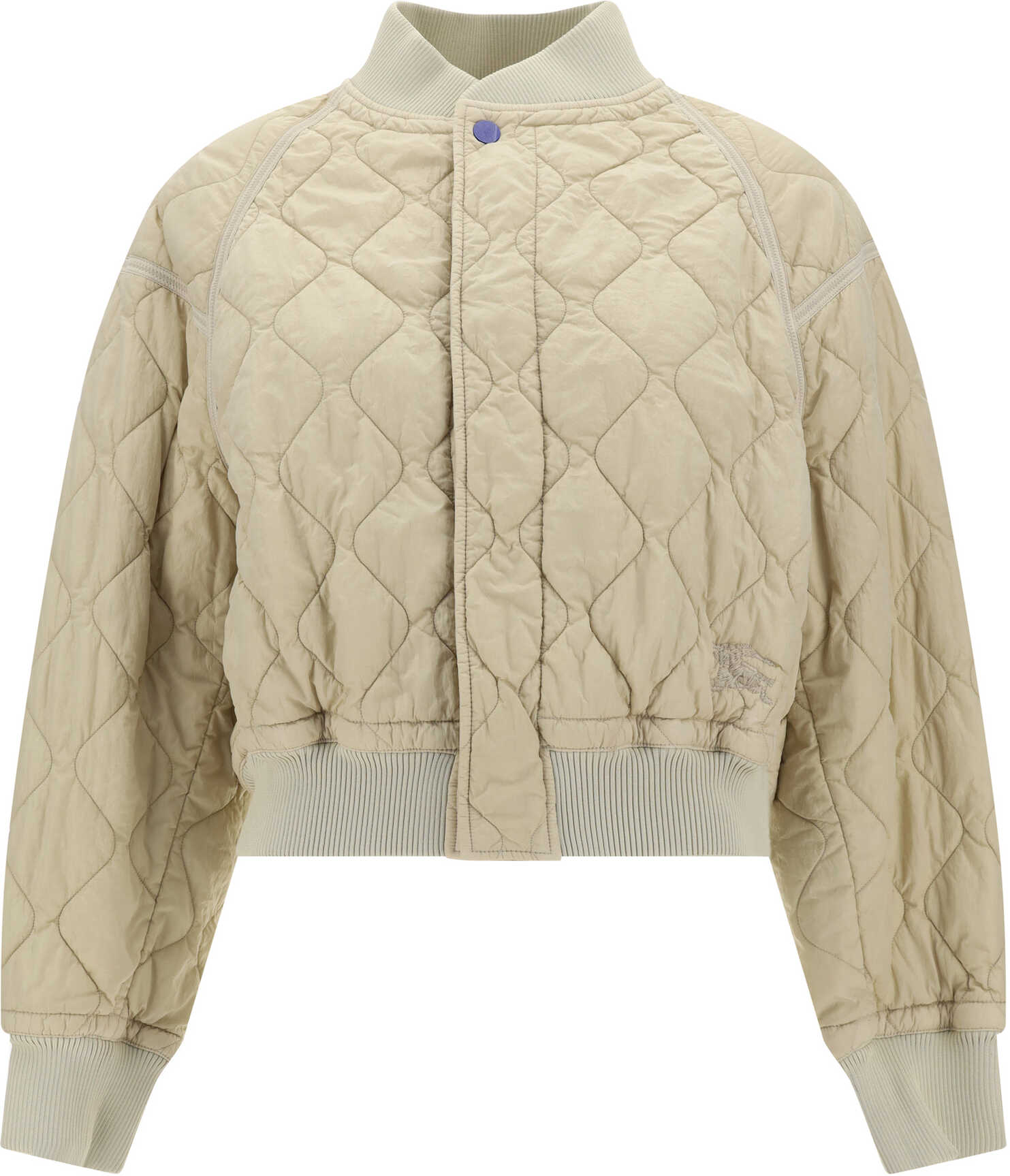 Jacket by Burberry, ribbed crew neck, snap button front closure, elastic ribbed cuffs, two side welt pockets, all-over quilted design, ribbed hem, regular fit.