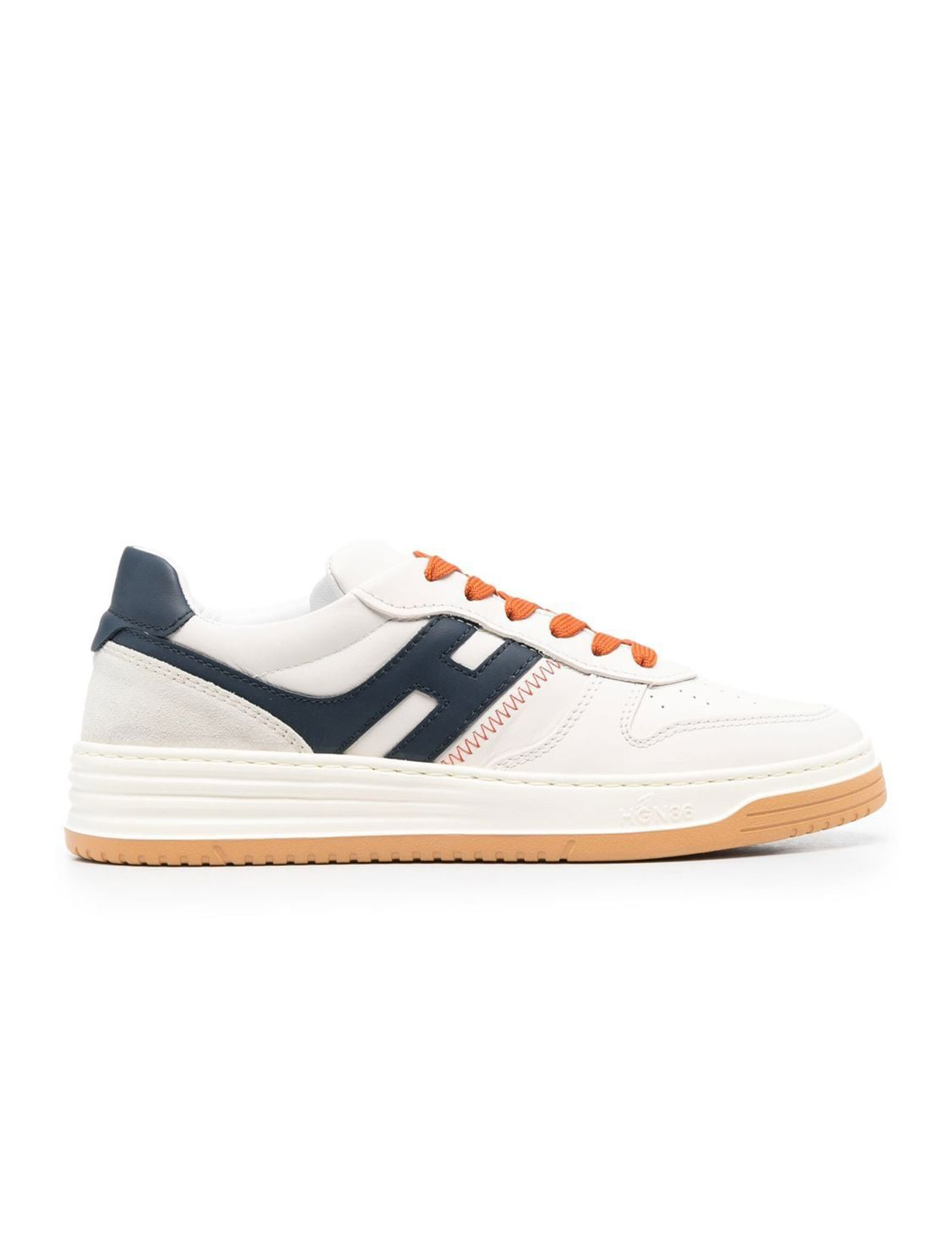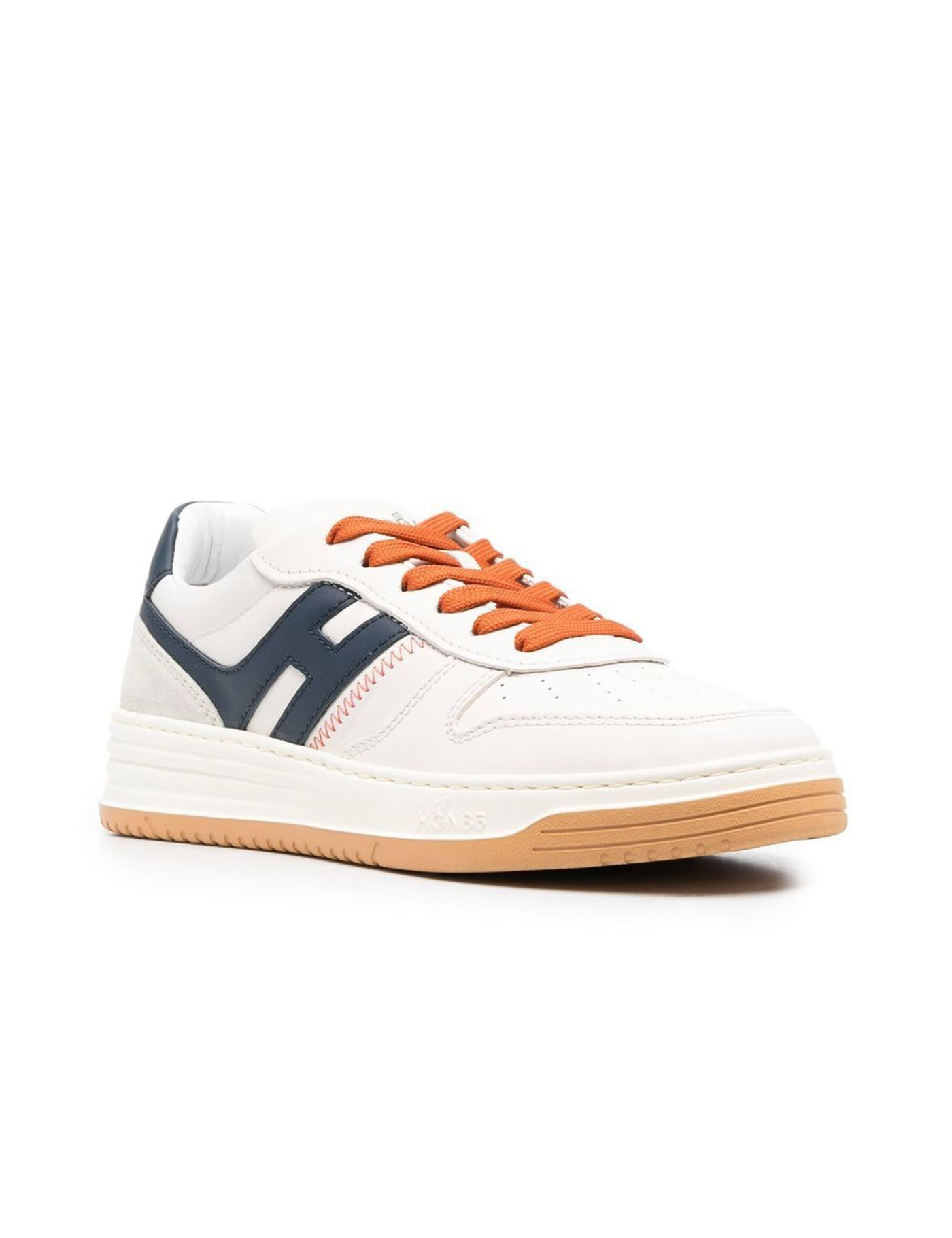Hogan H630 multicolor leather sneakers with lateral H logo and reinforced heel, red laces, brown sole.