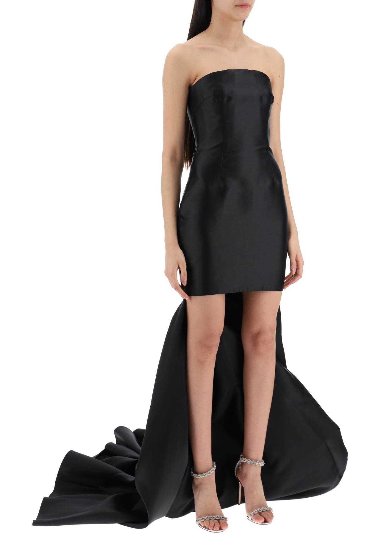 The Neva short strapless dress by Solace London is made of compact technical twill with a glossy finish, featuring a fitted silhouette enhanced by a long and voluminous back train. It has an invisible zip closure at the back and is fully lined inside. The model is 177 cm tall and wears a size L.
