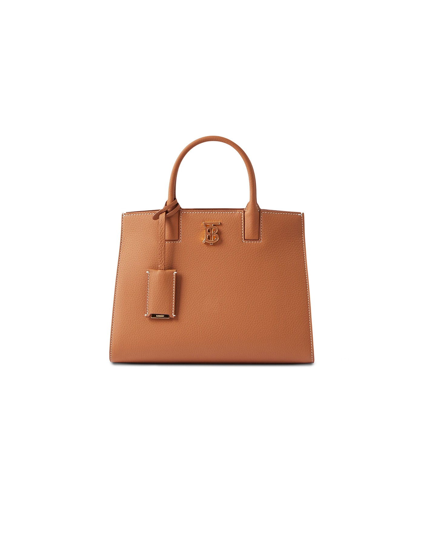 BURBERRY LEATHER FRANCES HANDBAG, RIGID LEATHER TOP HANDLES, INTERIOR SNAP BUTTON CLOSURE, MAGNETIC CLOSURES ON SIDE PANELS, ADJUSTABLE AND REMOVABLE FLAT SHOULDER STRAP WITH GOLD HARDWARE, METAL PATCH WITH ICONIC BRAND MONOGRAM APPLIED ON FRONT, WELT POCKET APPLIED ON BACK, TAG APPLIED AT BASE OF HANDLE WITH KNOTTED DETAIL, TWO INTERIOR WELT POCKETS.