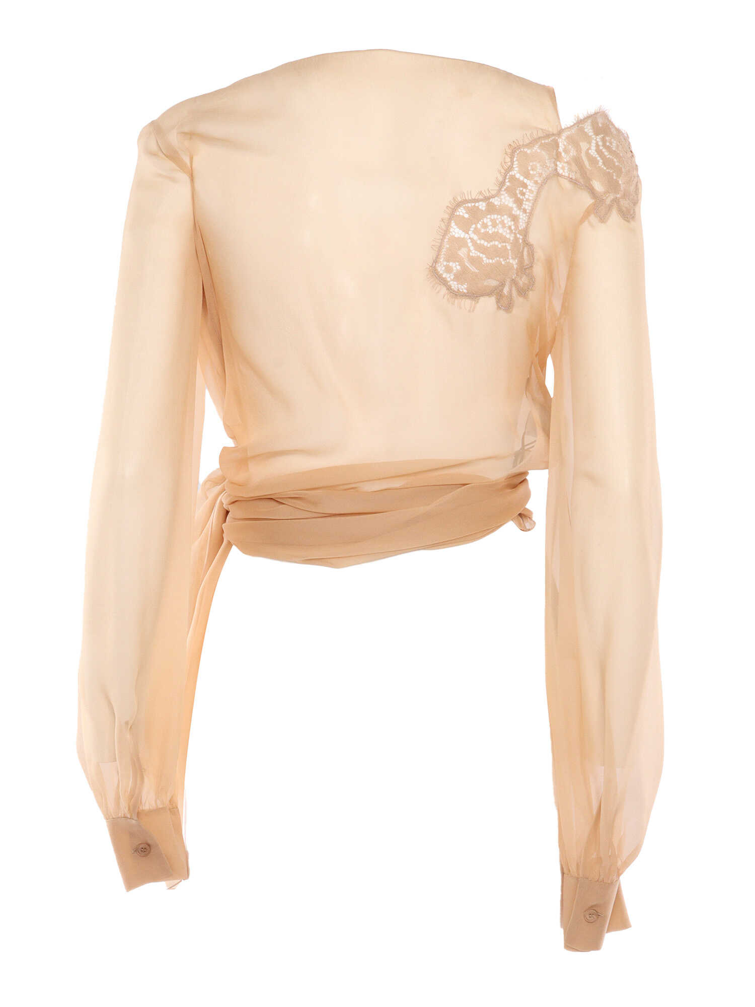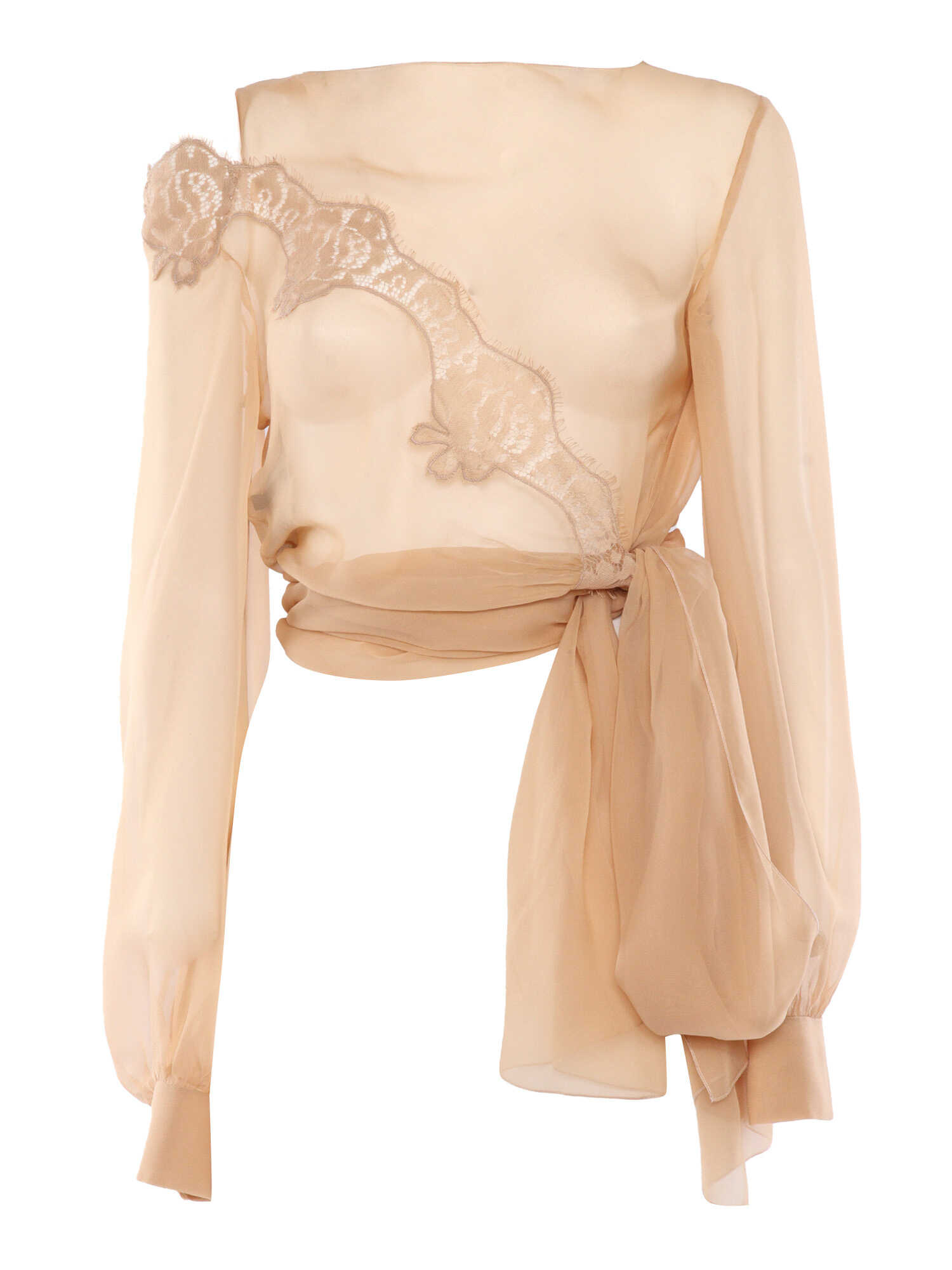 Transparent flesh-colored blouse with long sleeves, cuffs, lace insert, knot at the waist.