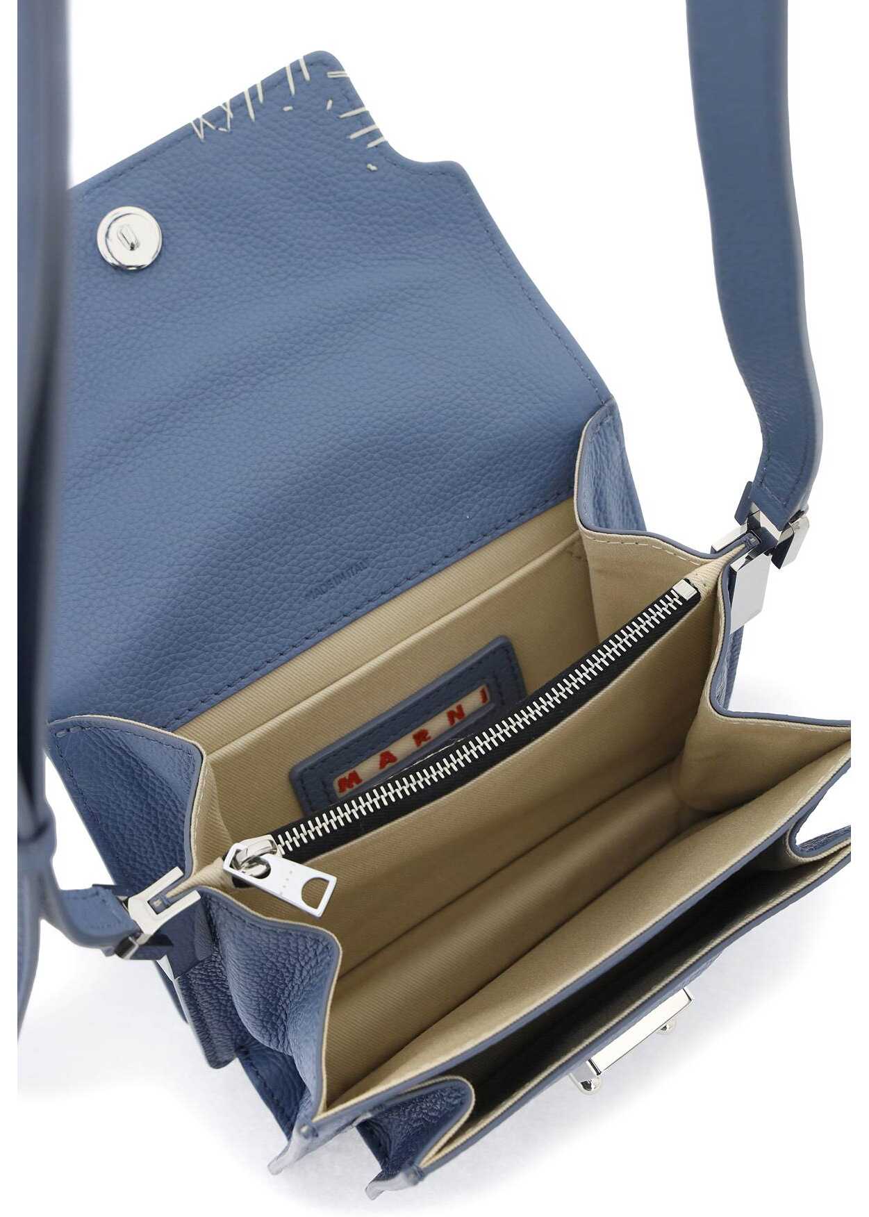 The Marni Trunk Soft mini shoulder bag is made of hammered leather with an adjustable strap and a snap closure flap. It features a back slit pocket, three compartments, one zippered interior pocket, one open pocket, and fabric lining. The flap is adorned with embroidered logo lettering. Metallic accessories have a silver finish.