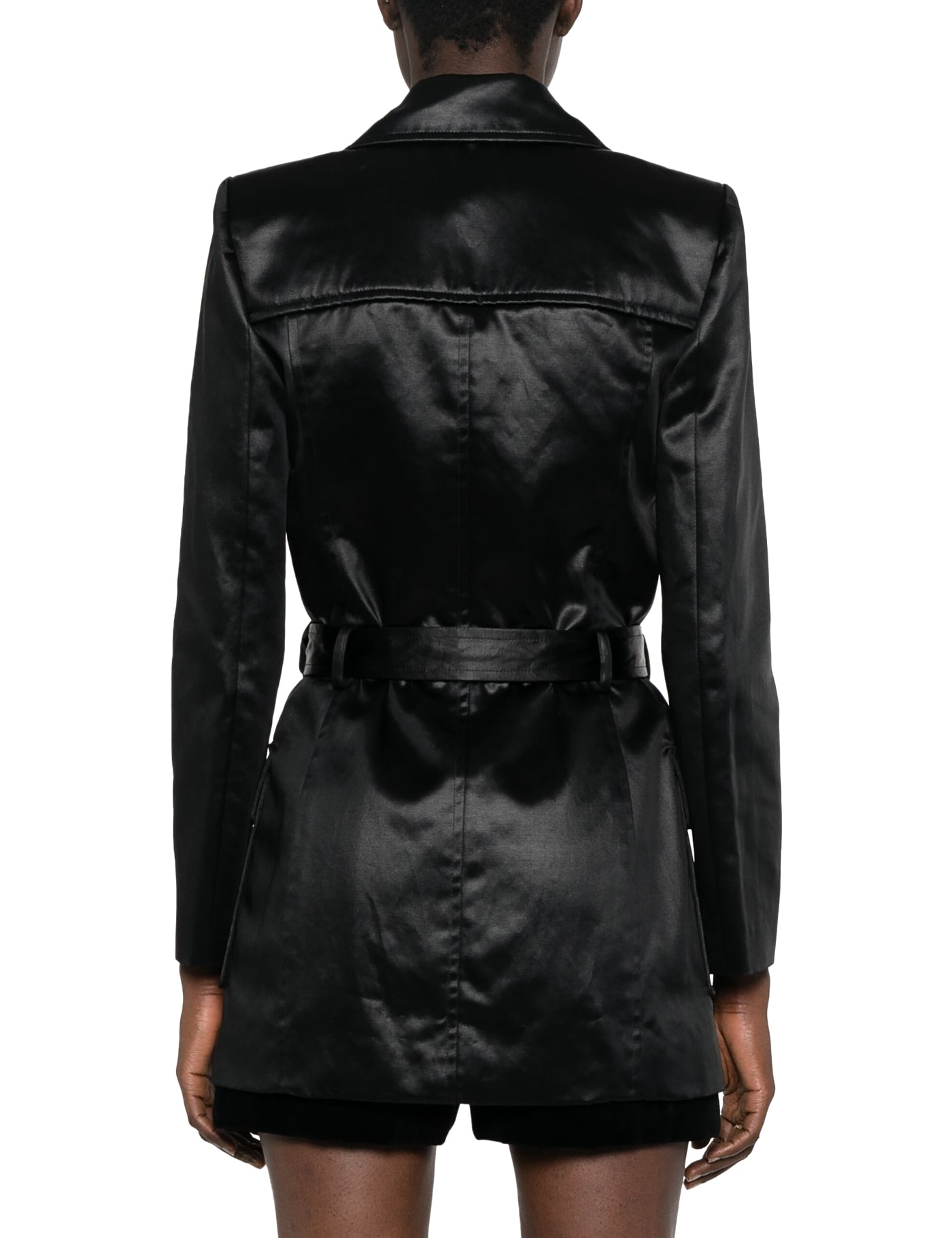 Cotton Trench Jacket by Saint Laurent, spear lapels, double-breasted front button closure, two patch pockets on front, satin-effect design, adjustable applied waistband, monochrome pattern, regular fit.