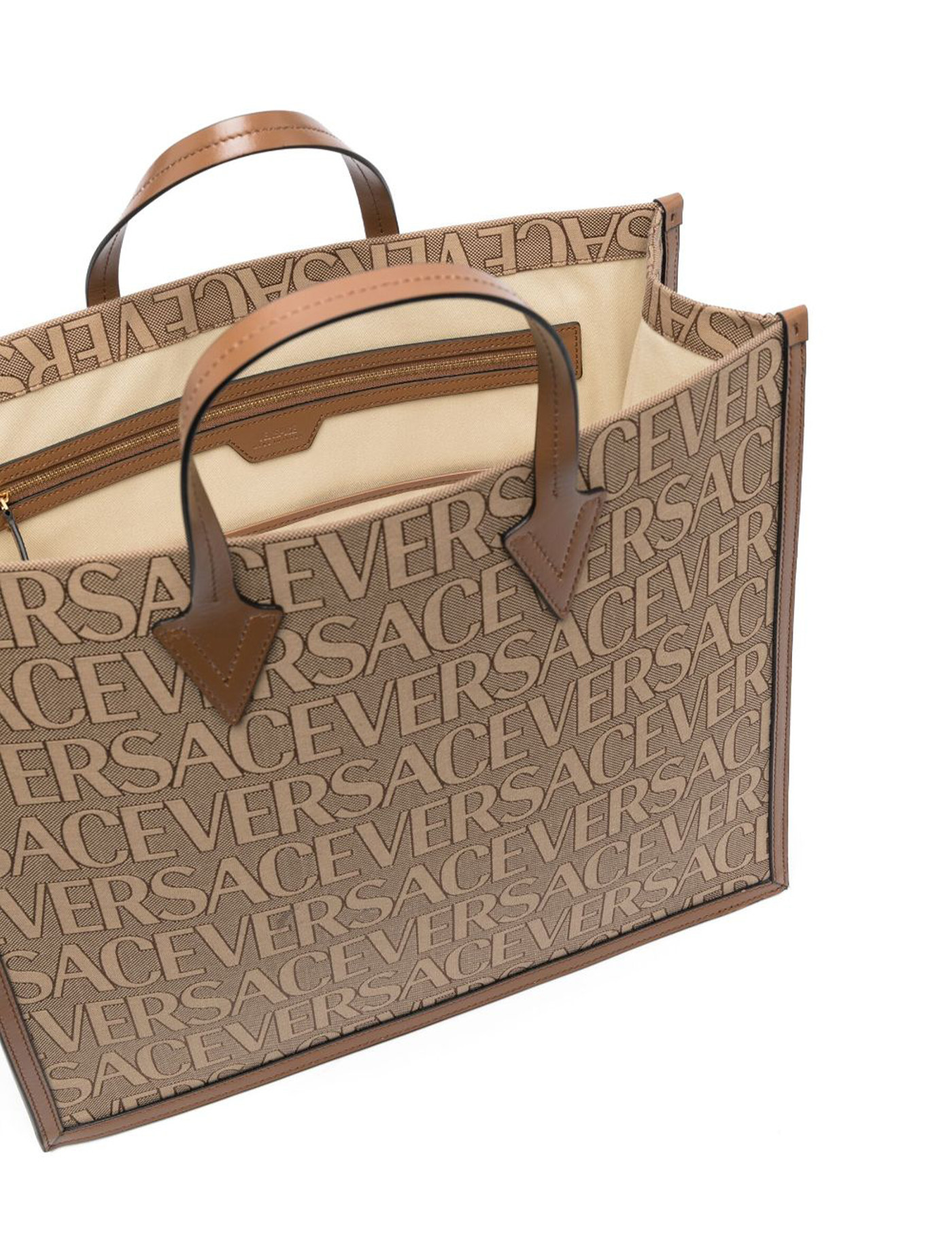 Brown canvas and leather Allover tote bag from Versace featuring jacquard logo motif, gold-tone hardware, D-ring findings, two flat top handles, adjustable detachable shoulder strap, open top and internal zip-fastening pocket.