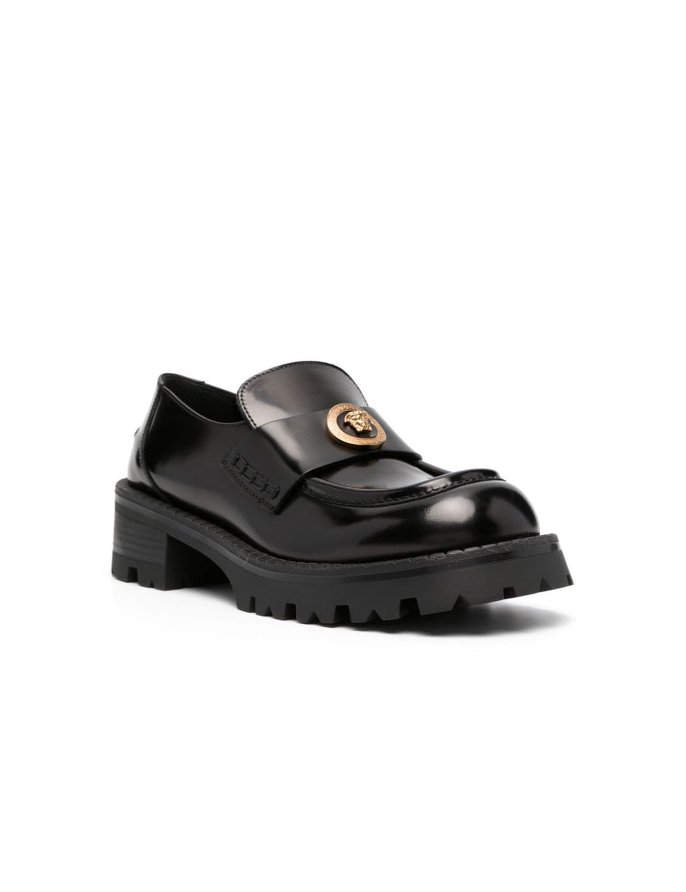 Versace presents Alia patent leather loafers with an enameled Medusa emblem on the front strap.