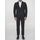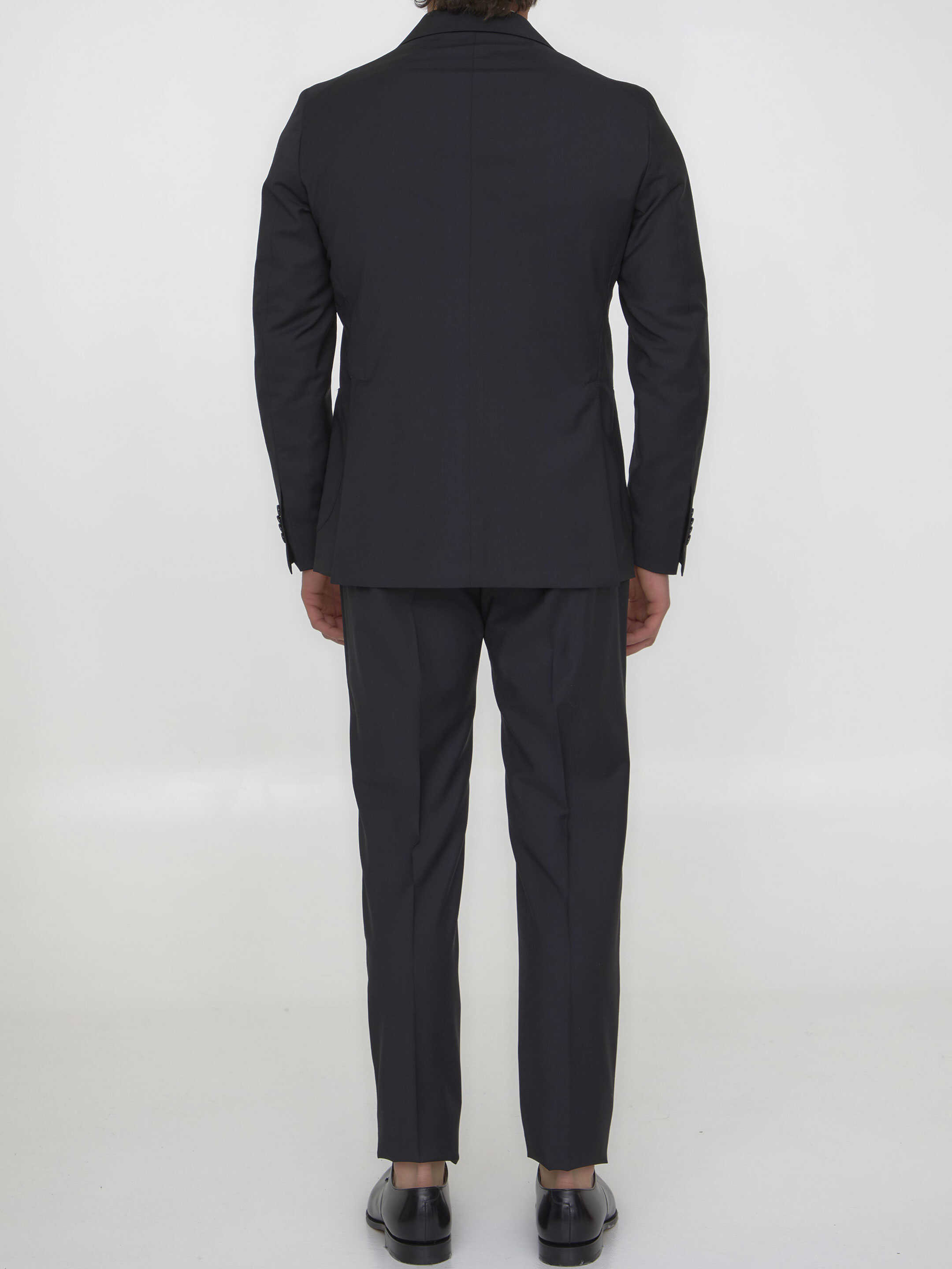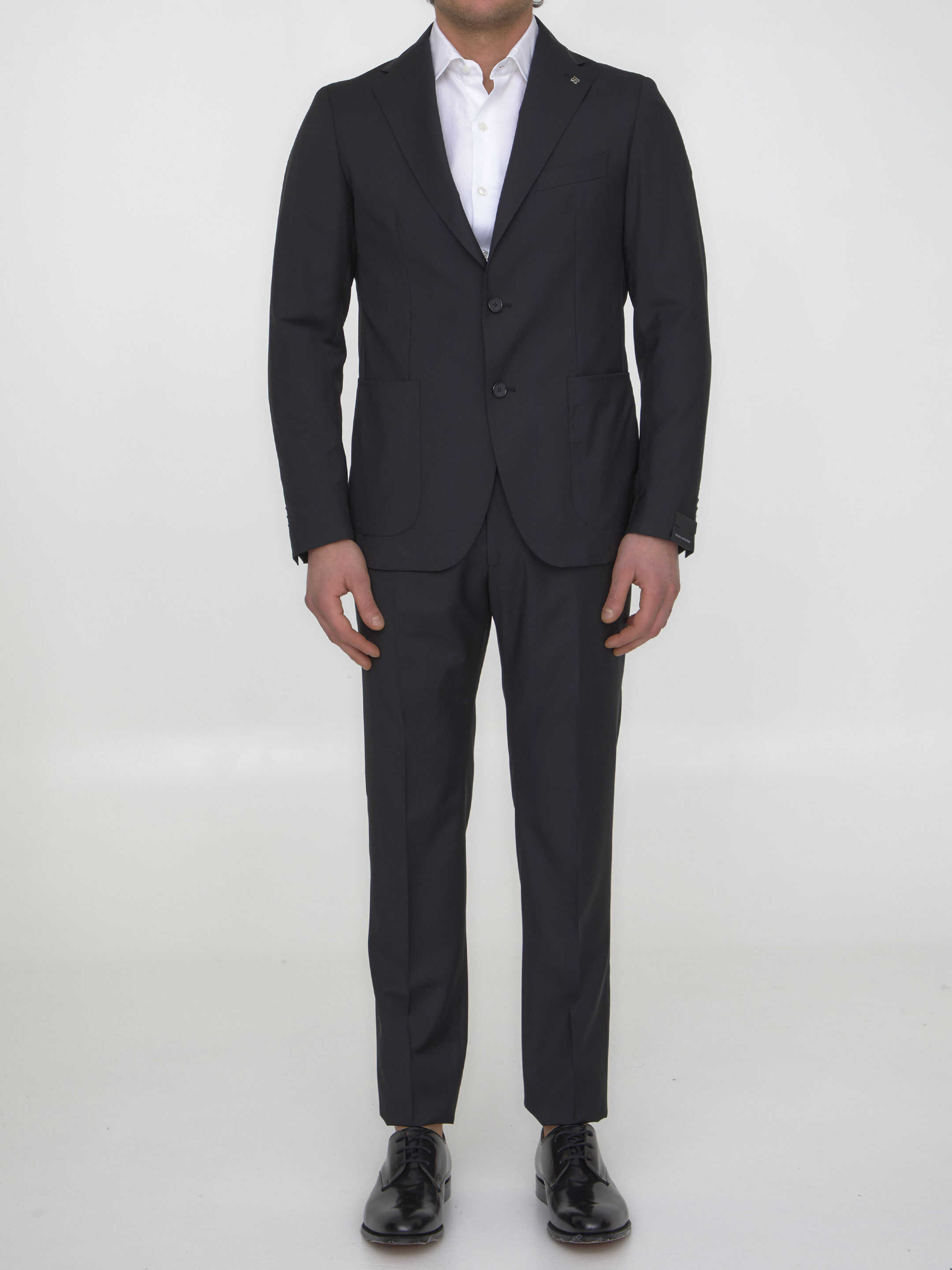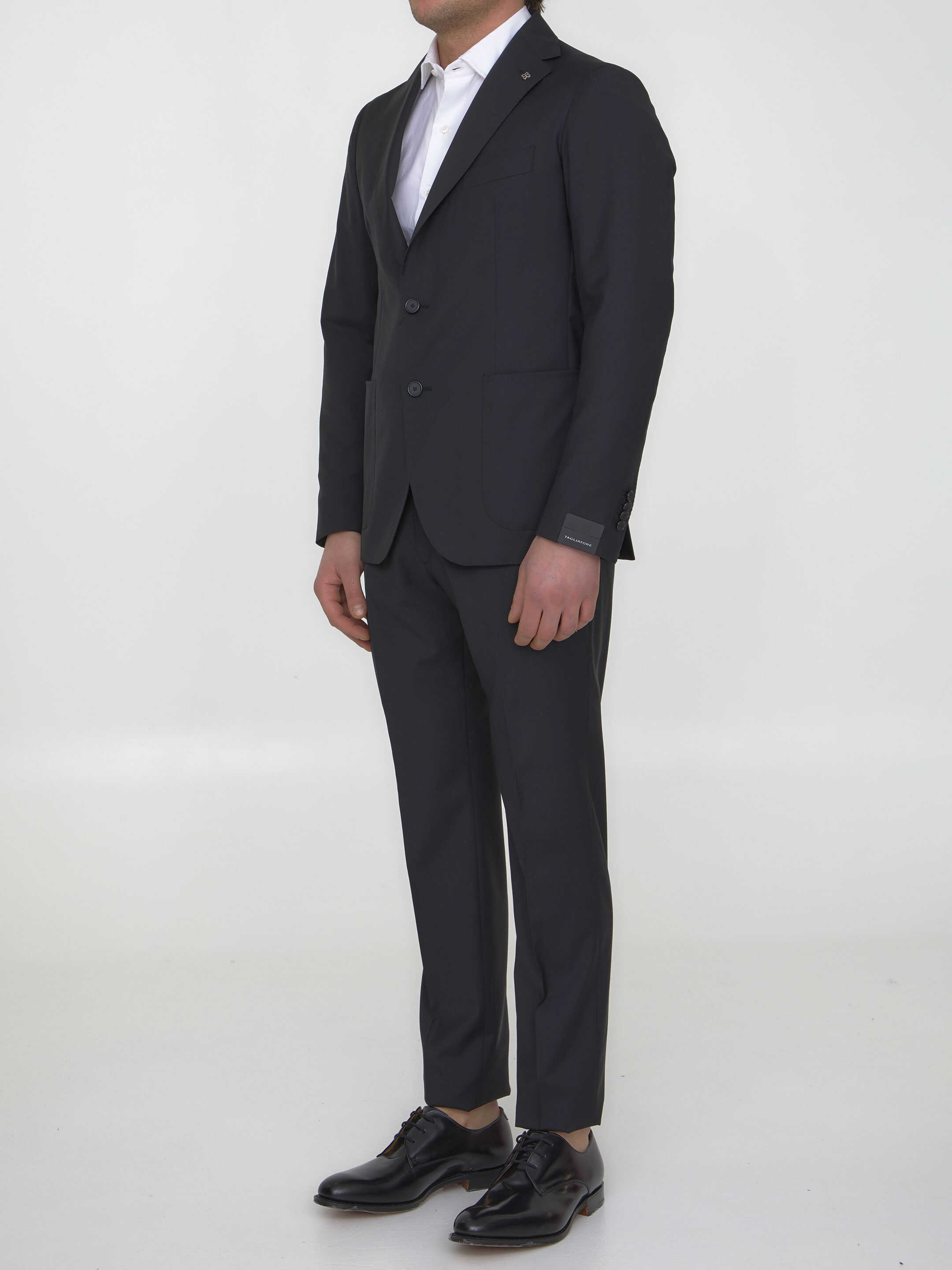 Two-piece suit in black virgin wool. Single-breasted jacket with Tagliatore brooch on lapel, classic lapels, two front patch pockets, a welt pocket on chest and buttoned cuffs. Pleated pants with zip, button and hook-and-eye closure, two side welt pockets and one rear buttoned welt pocket.
