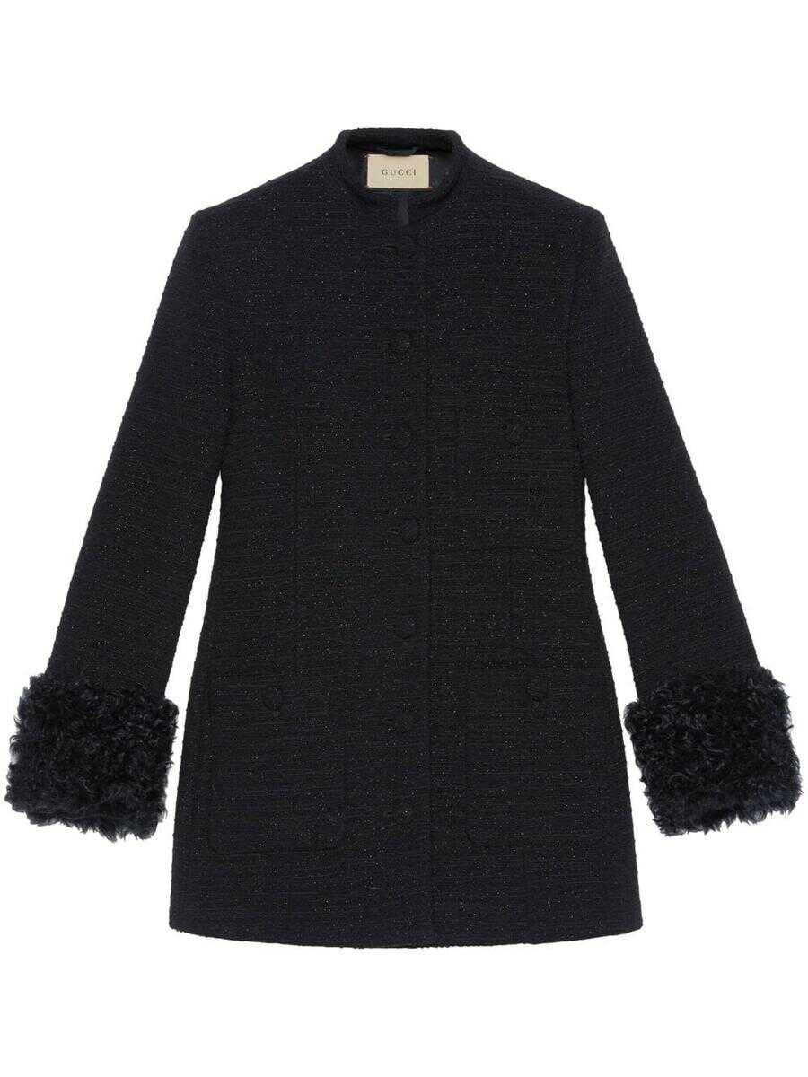 Gucci presents casual and formal garments presented in new super feminine silhouettes inspired by the `70s. Like this jacket made of wool tweed featuring fur details. - Jacket with fur cuffs - Color: Black - Lined - Crew neck - Three front pockets with covered buttons - Button closure - Made in Italy - Fabric: 85% WO, 15% PA - Lining: 100% VI