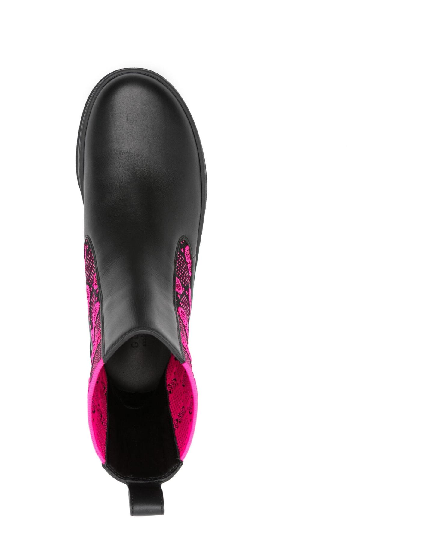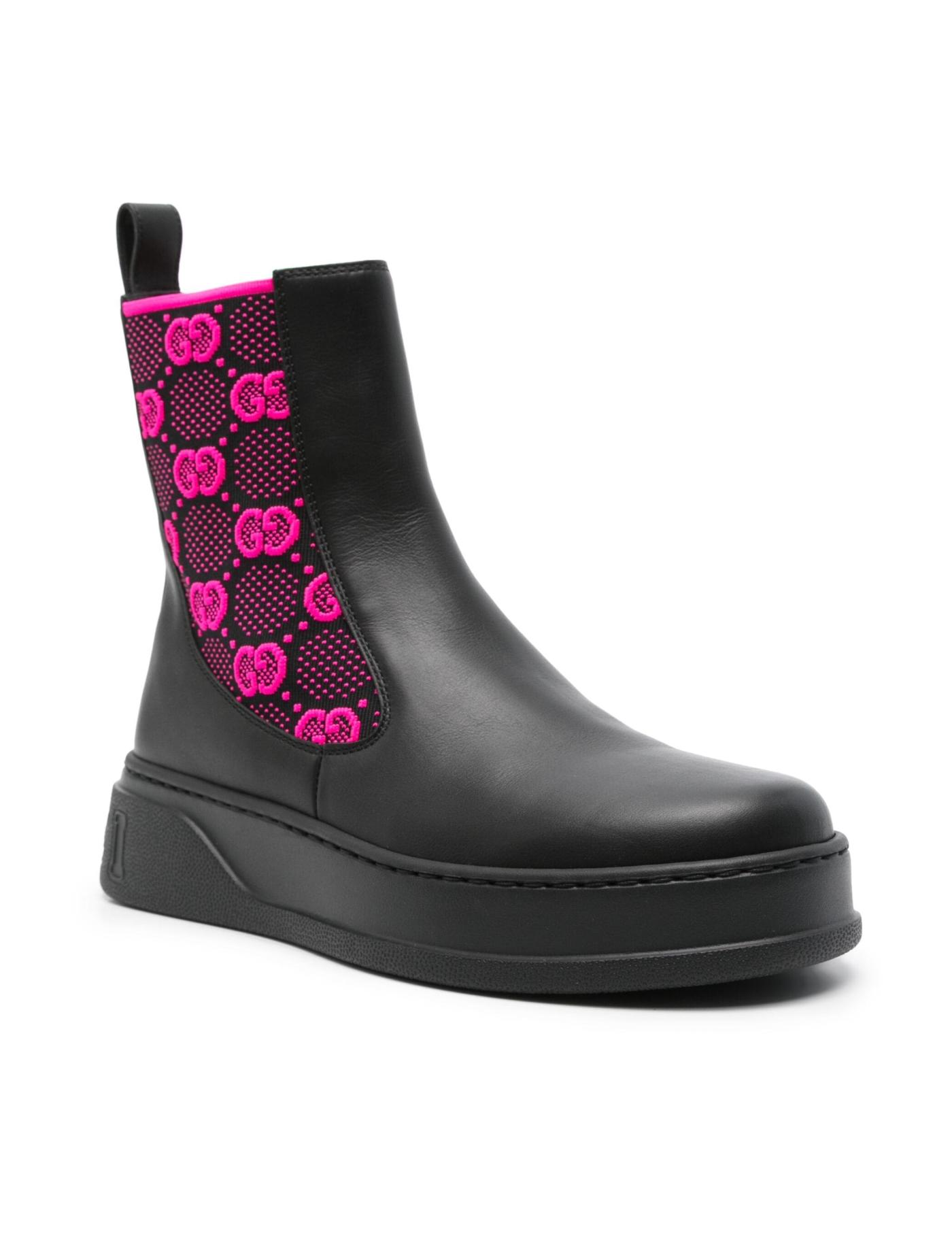 Adorned with the Italian fashion House’s distinctive monogram on the fuchsia pink elasticated side panels, these ankle boots are a nod to Gucci’s distinguishable house codes. Crafted from black leather, the slip-on pair is accented with a debossed logo detail at the heel.