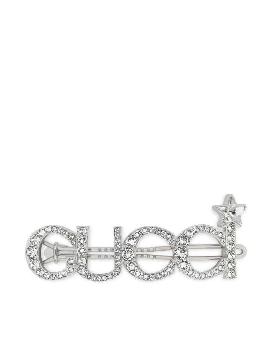 Gucci presents the Maison`s name above this hair clip with sparkling crystal details.