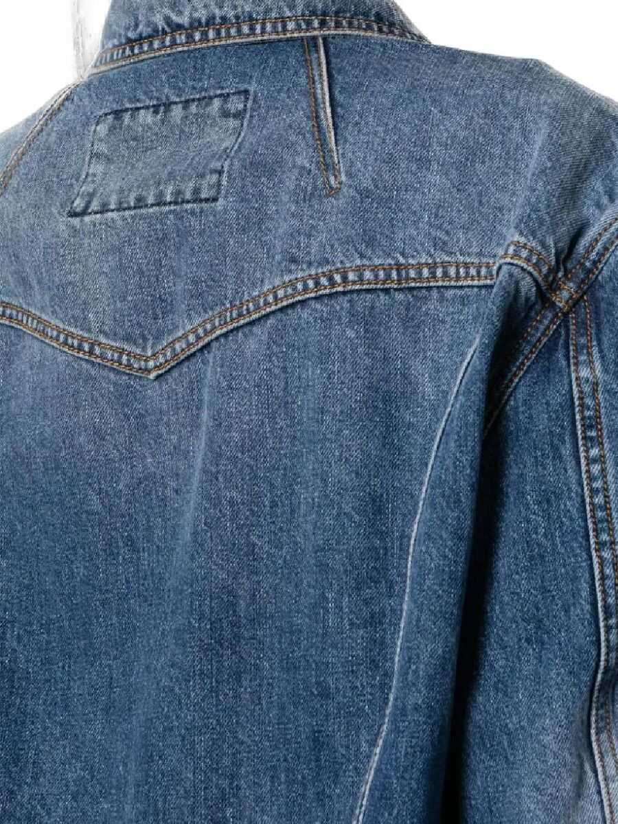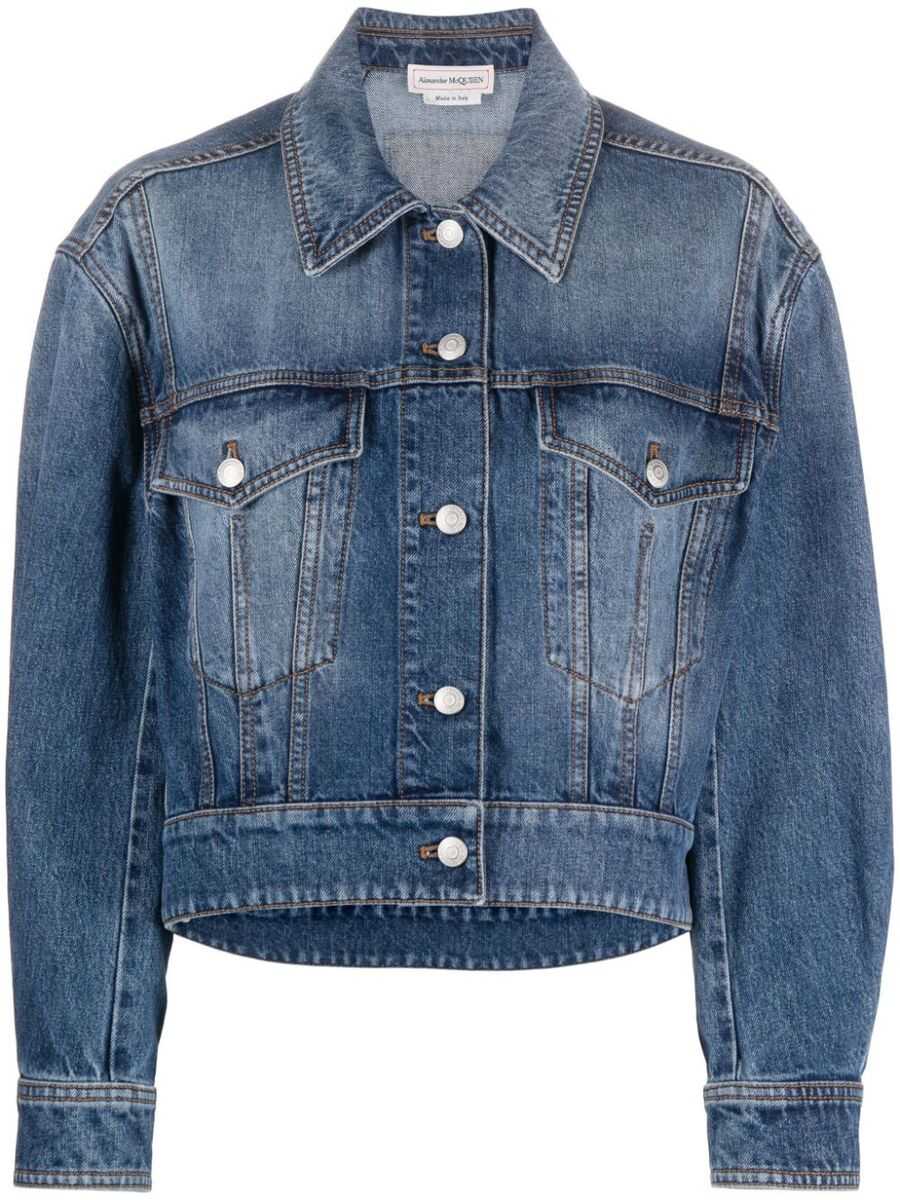 indigo blue cotton denim classic collar front button fastening two chest flap pockets long sleeves buttoned cuffs cropped