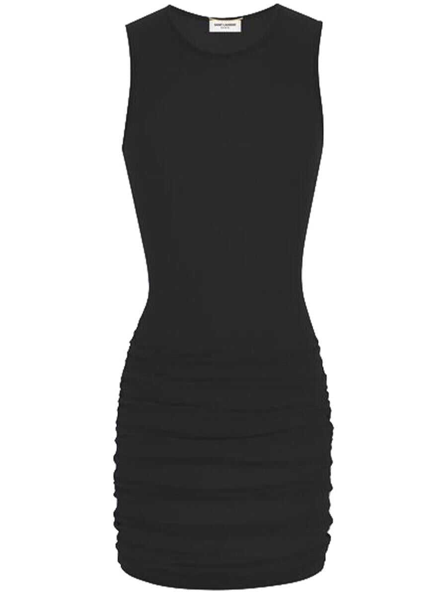 Saint Laurent presents this camisole dress made of delicate semi-transparent fabric with side gathers. - Tulle camisole dress - Color: black - Viscose lining - Round neckline - 100% PA - Made in Italy - Sleeveless