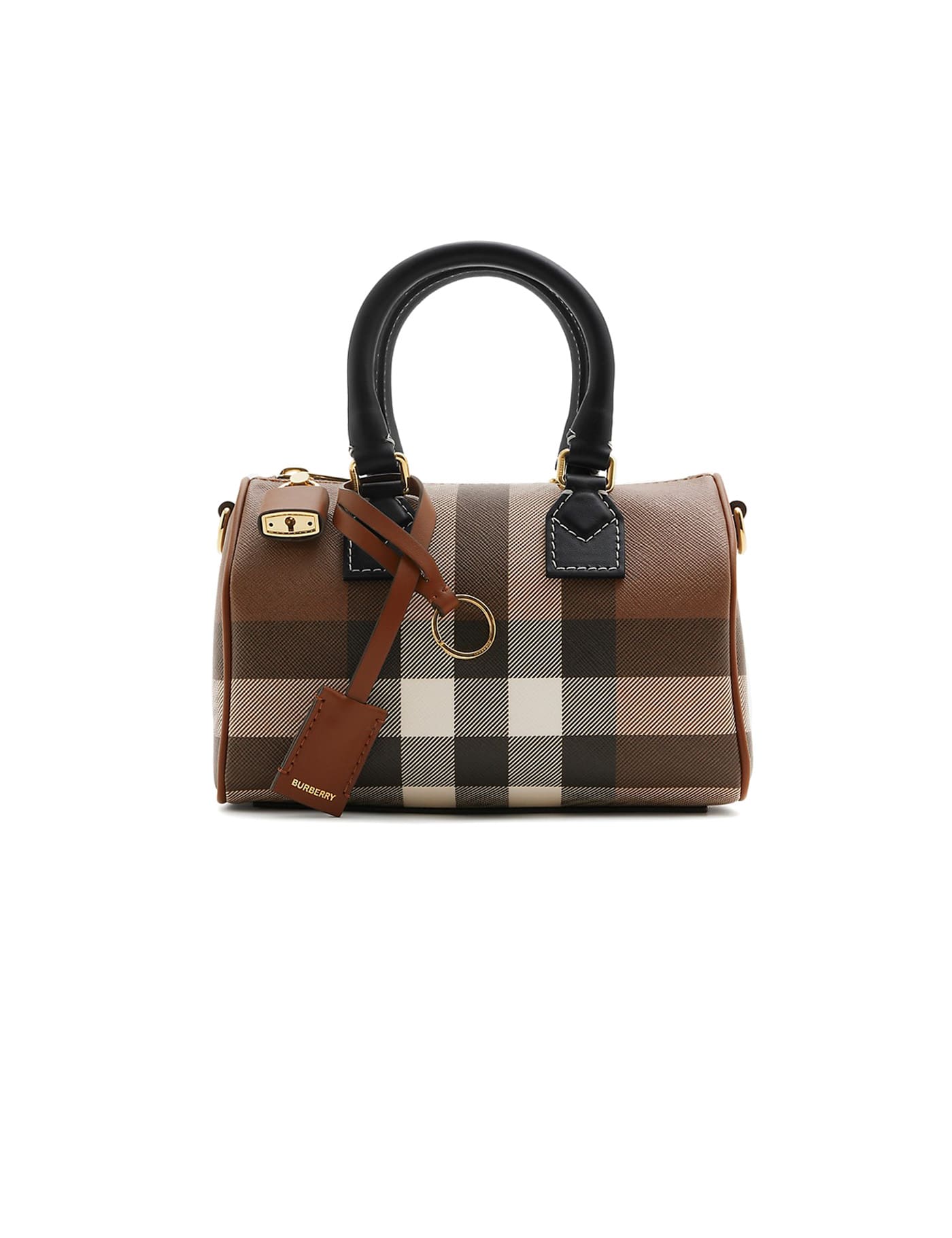 Check mini bowling bag from BURBERRY featuring barley brown, cotton blend, bold check pattern, top zip fastening, main compartment, circular top handles and detachable shoulder strap.