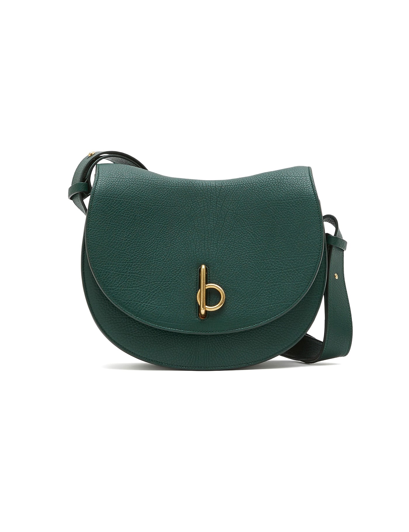 Burberry's shoulder bag crafted in dark green grained leather. It features gold-tone hardware, foldover flap with 'b' closure and adjustable shoulder strap. Tone-on-tone leather-lined interior with Check pattern embossed. The design is completed by Equestrian Knight logo embossed at back.