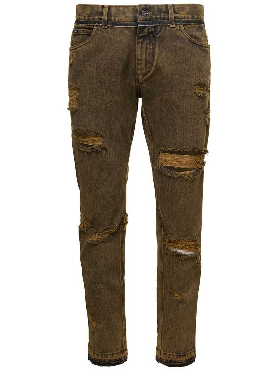 Brown Straight Jeans with Rips in Cotton Denim Man