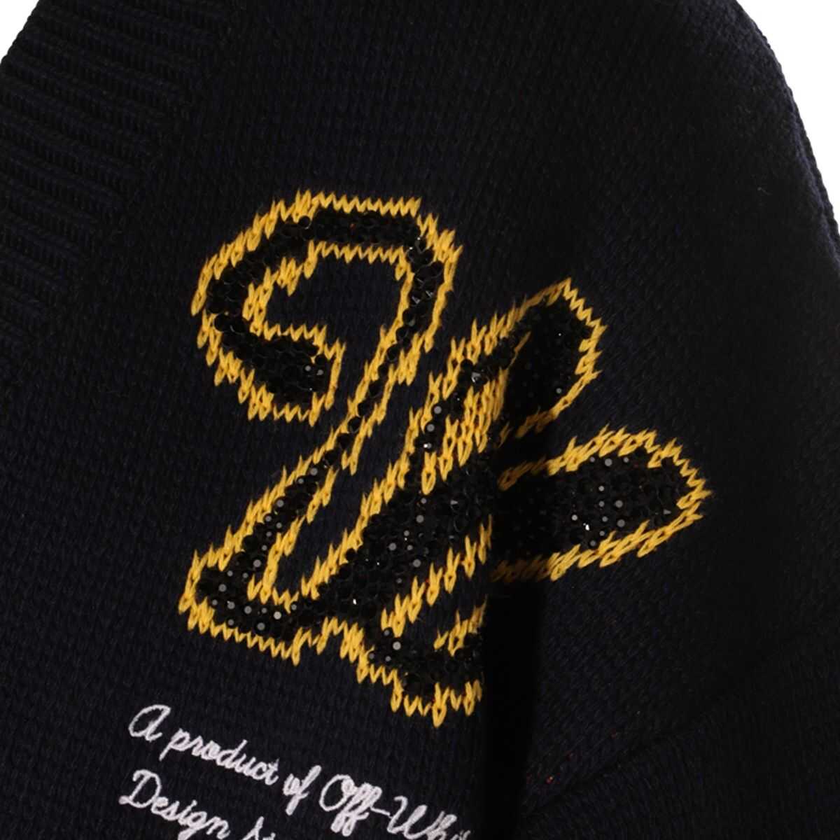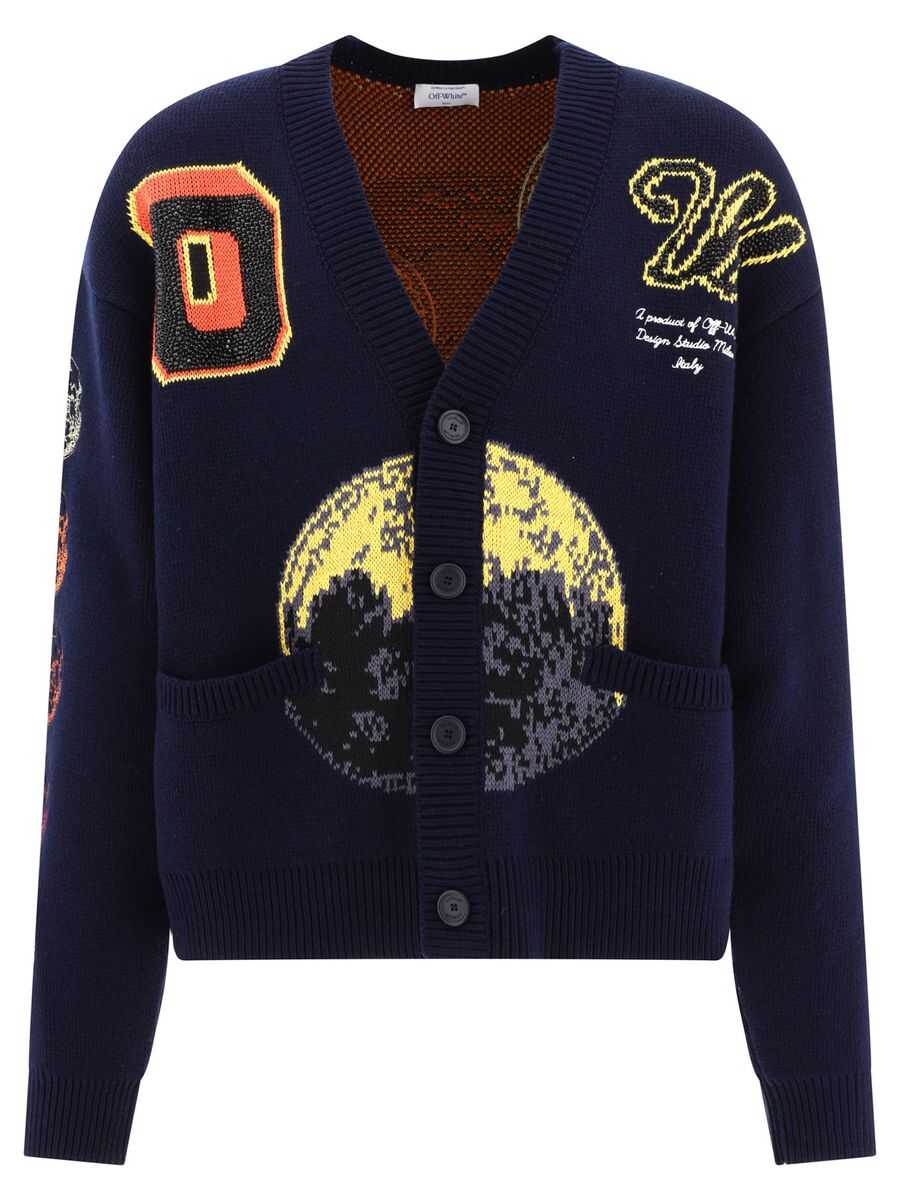 Blue and multicolour wool blend Moon Phase cardigan from Off-White featuring long sleeves, button closure, regular fit, multicolour patches and embroidered logo signature at chest. Size Type: AMERICA