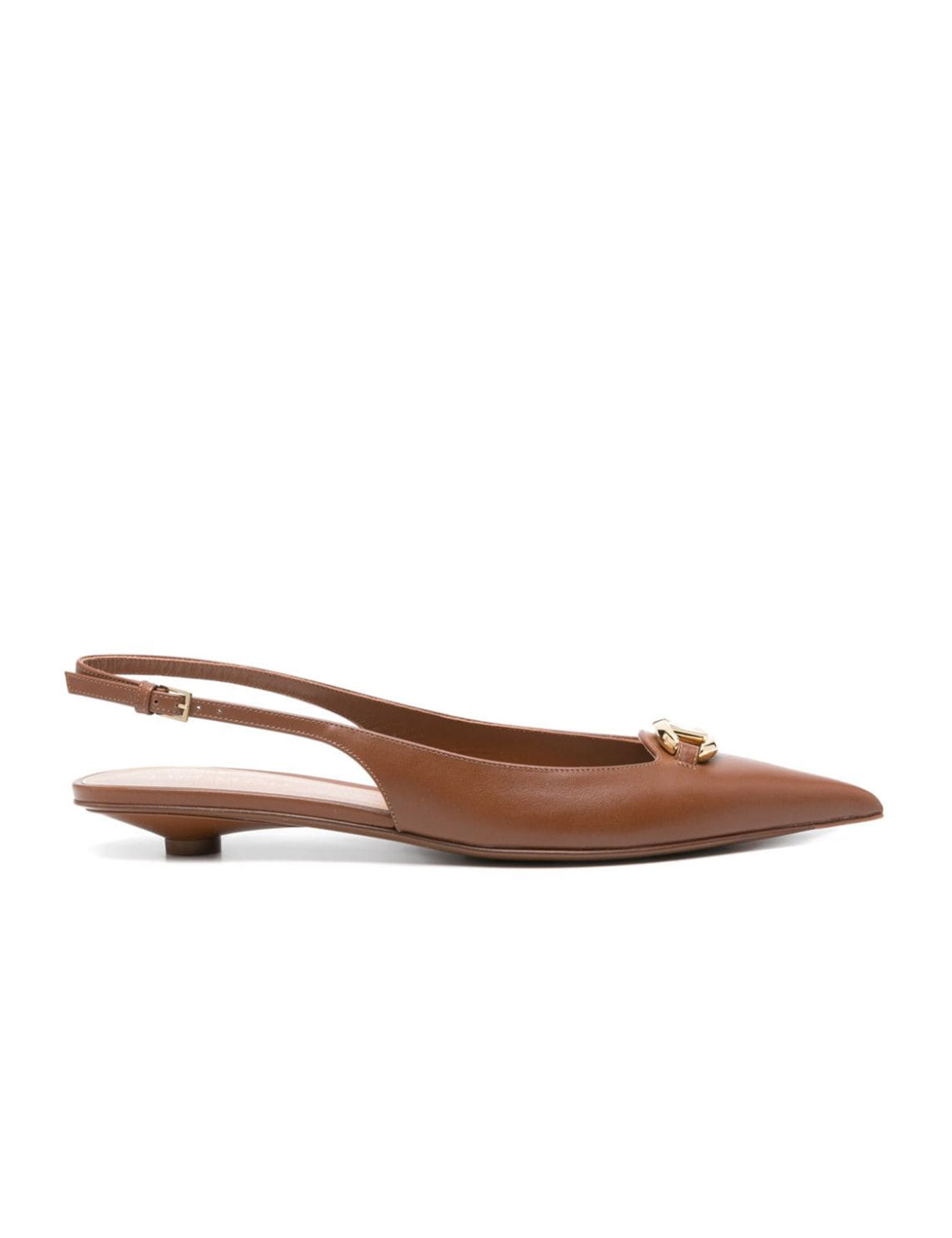Valentino Garavani's slingback ballerina flats are crafted in smooth leather and embellished with a gold metal VLogo Signature detail. The pointed design features an adjustable strap, leather lining and insole, an oval-shaped lacquered heel, and a leather sole with rubber insert.