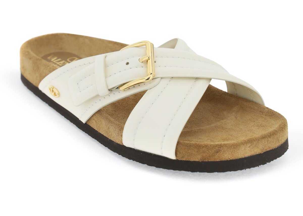 Valentino Garavani's Fussfriend slides feature smooth quilted leather criss-cross straps, detailed with the iconic VLogo Signature and a golden metal buckle. The suede leather insole and rubber sole provide comfort and durability. Elevate your summer look with these stylish and luxurious sandals.
