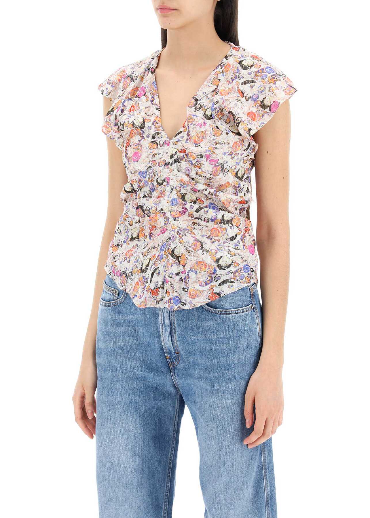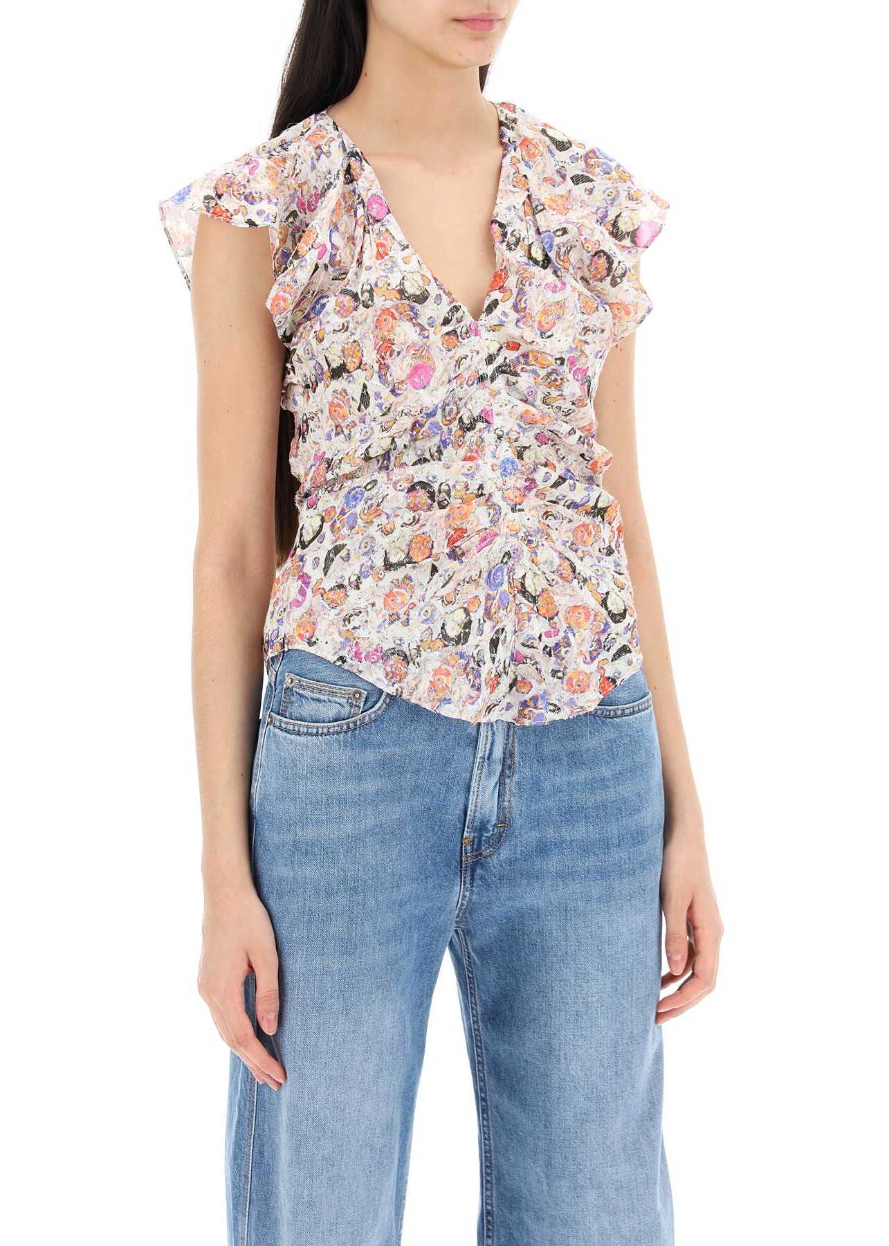 The Lonea Isabel Marant top is made of jacquard fabric with a mix of viscose and printed lurex all over. It features ruffled sleeves, a V-neckline, draped front, and a zip closure at the back with cut-out detailing. The slim fit enhances the figure. The model is 177 cm tall and wears a size FR 34.