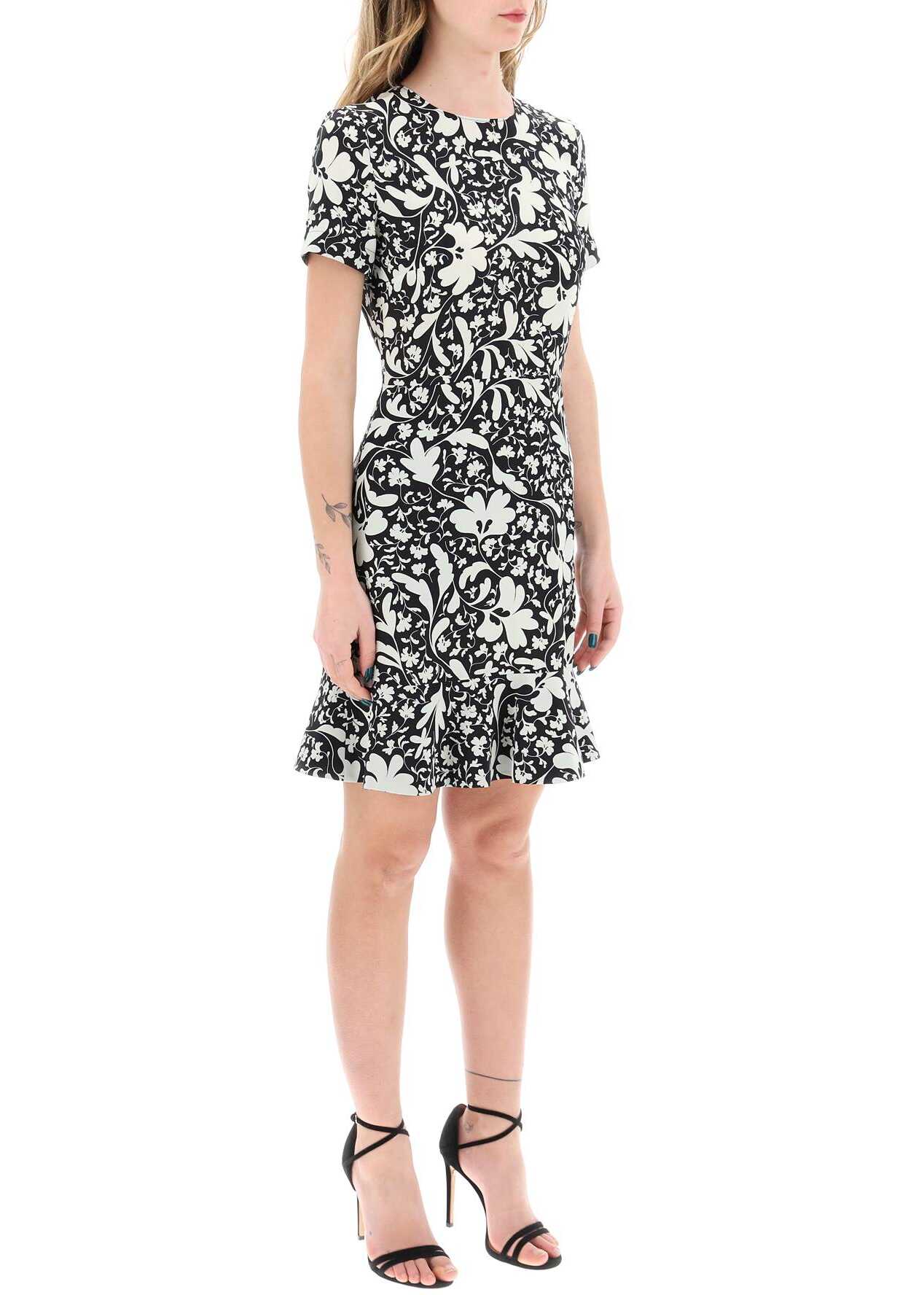 This short-sleeved mini dress by Stella McCartney is made of fluid organic silk crepe de chine with an all-over floral pattern. It features a round neckline, side pockets, and a hidden back zipper closure. The flared silhouette has a waist cut and a ruffled hemline. The model is 177 cm tall and wears an IT size 38.
