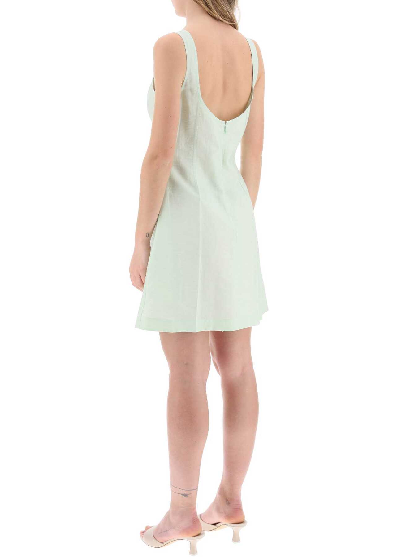 This Stella McCartney mini dress is made of cotton and linen twill with a flared silhouette. The design features structured corset-style inserts on the front and sides, a square neckline, and pockets inserted into the side seams. It has a hidden zip closure at the back. The model is 177 cm tall and wears an Italian size 40.