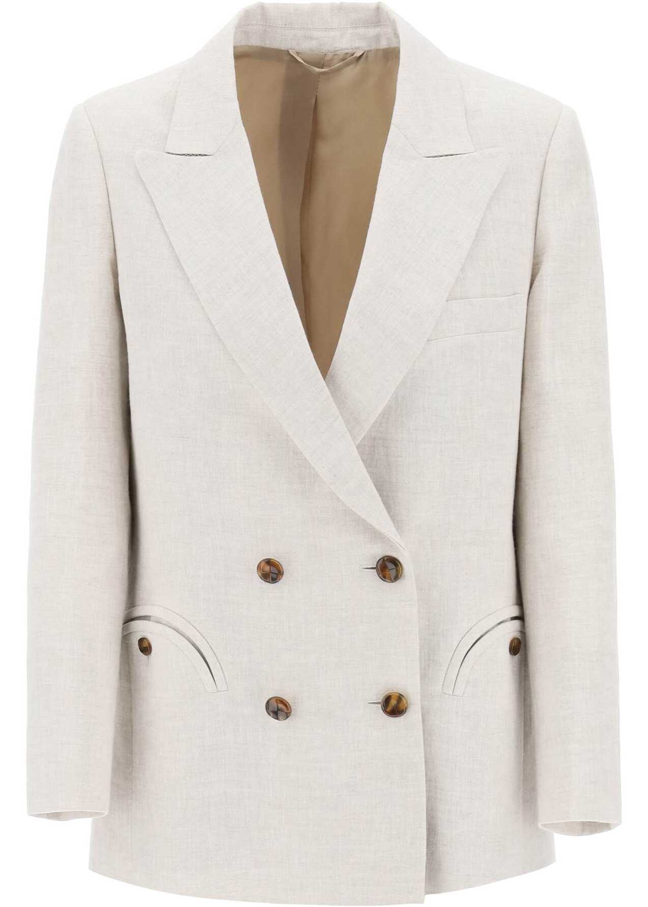 Blazé Milano Everyday Mid-Day Sun blazer crafted in pure linen canvas, characterized by a double-breasted design with Loden button closure. It features peak lapel, a chest welt pocket, iconic Smiley pockets and double back vent. Lined and provided with one internal pocket. Regular straight cut with structured padded shoulders. The model is 177 cm tall and wears size 0 Blazé Milano.