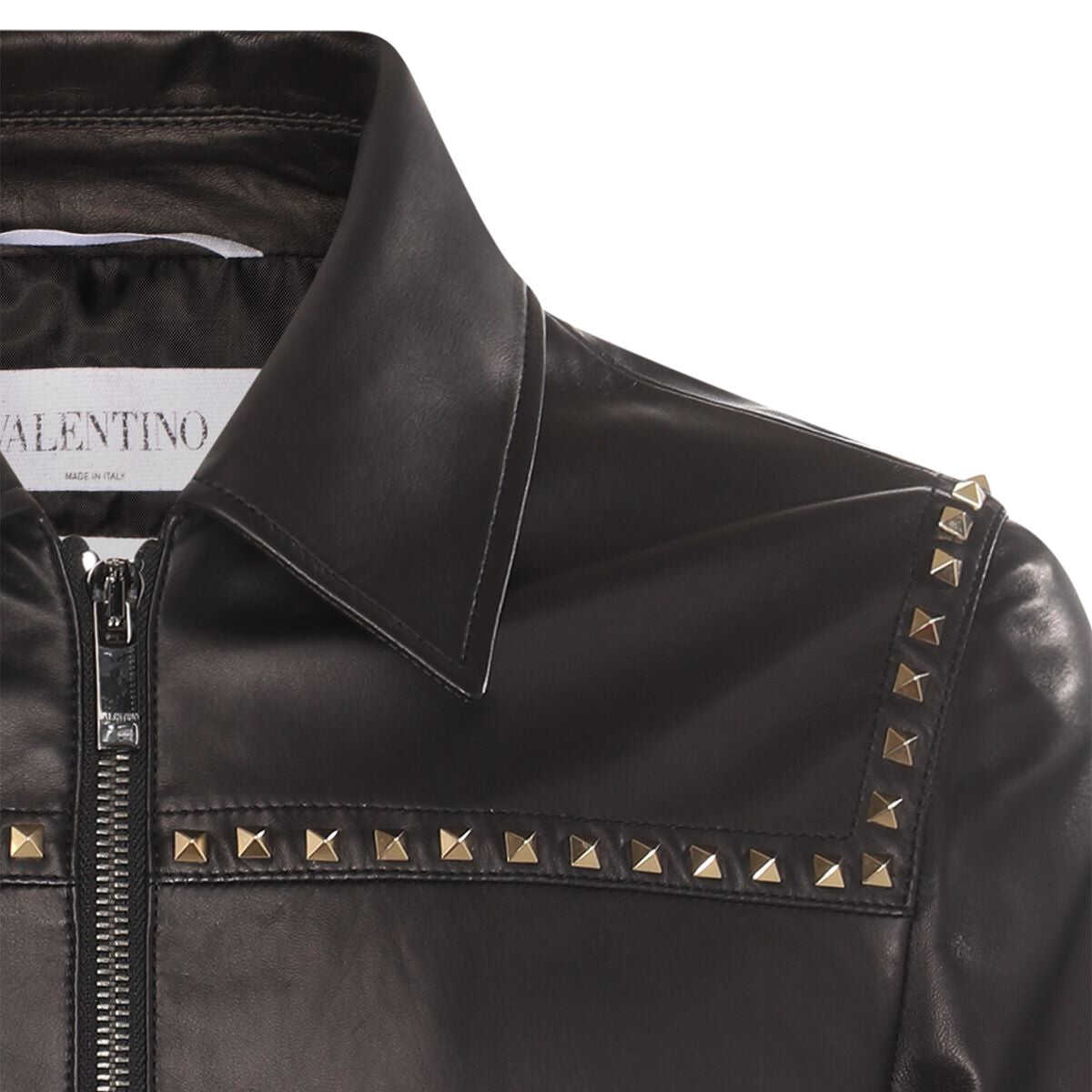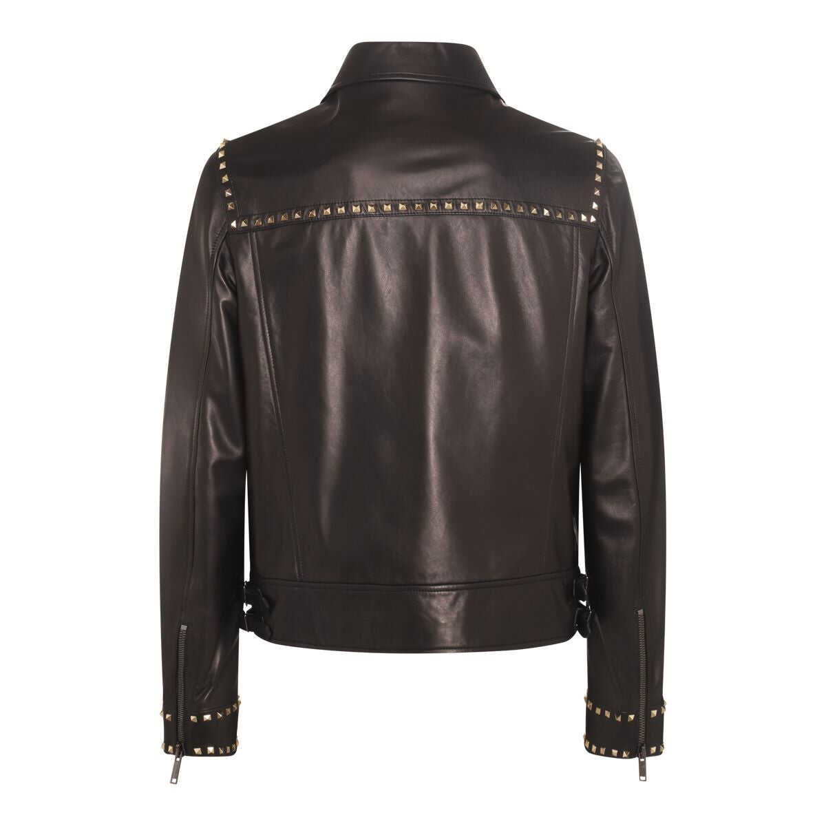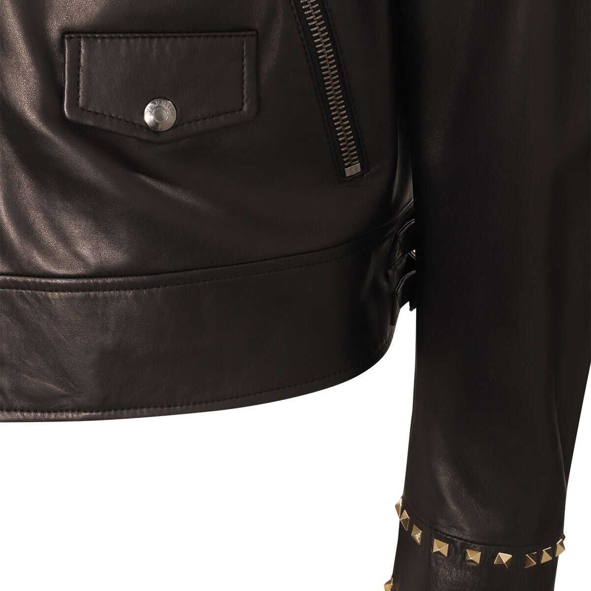 Black leather jacket from Valentino featuring zip closure, long sleeves, shirt collar, side zipped pockets and studs details.