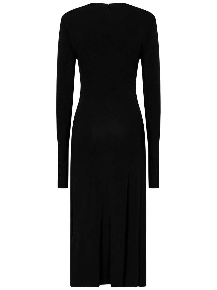black crepe texture stretch-design high neck long sleeves logo stamp to the front twist detailing front slit below-knee length