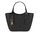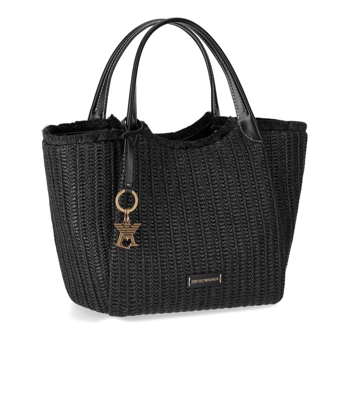 Emporio Armani bag made of black straw-effect fabric, characterized by frayed edges, top handles and detachable logo charm. Lined interior with zip pocket. Closure with carabiner, measurements 30x29x17.5 cm.