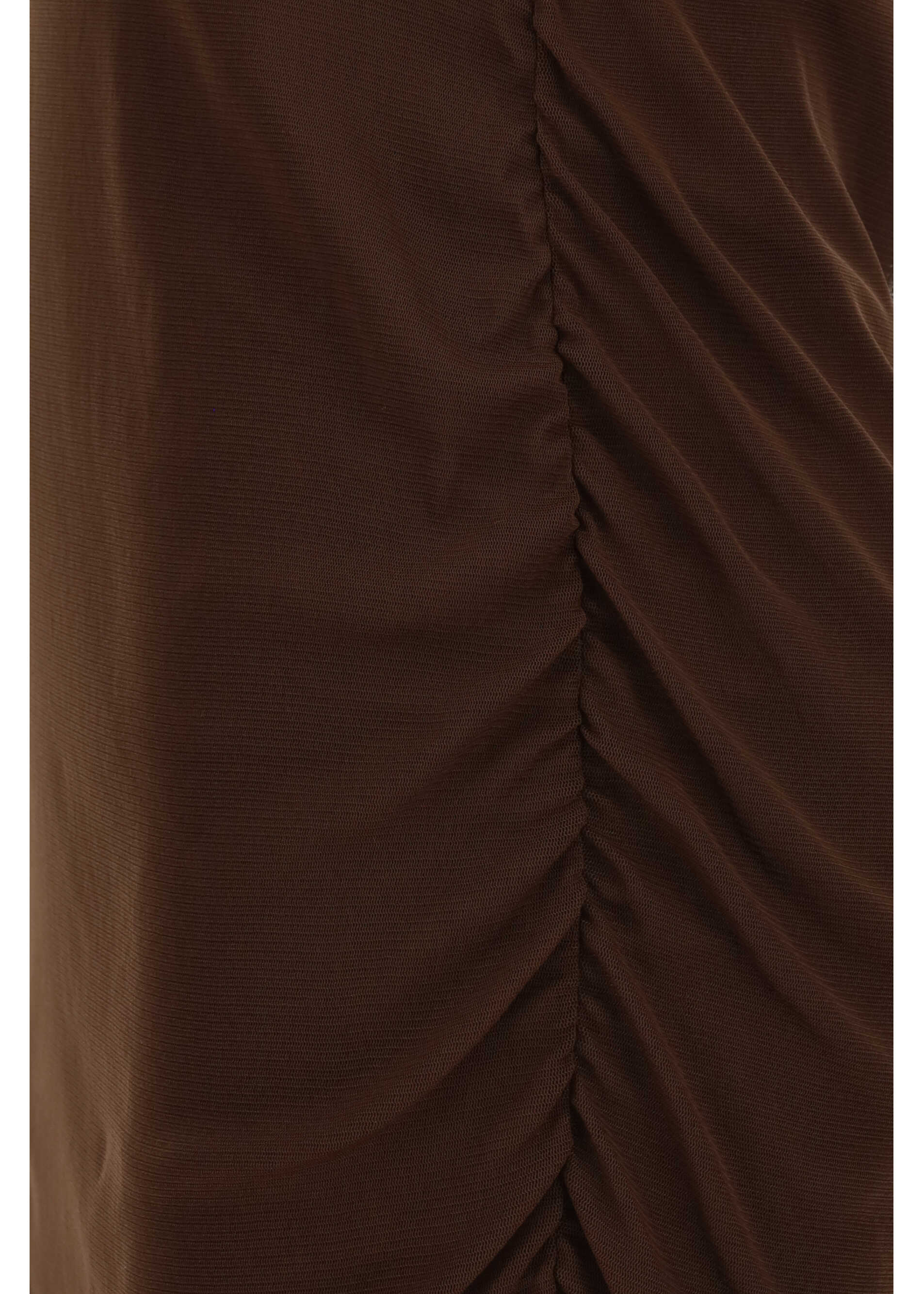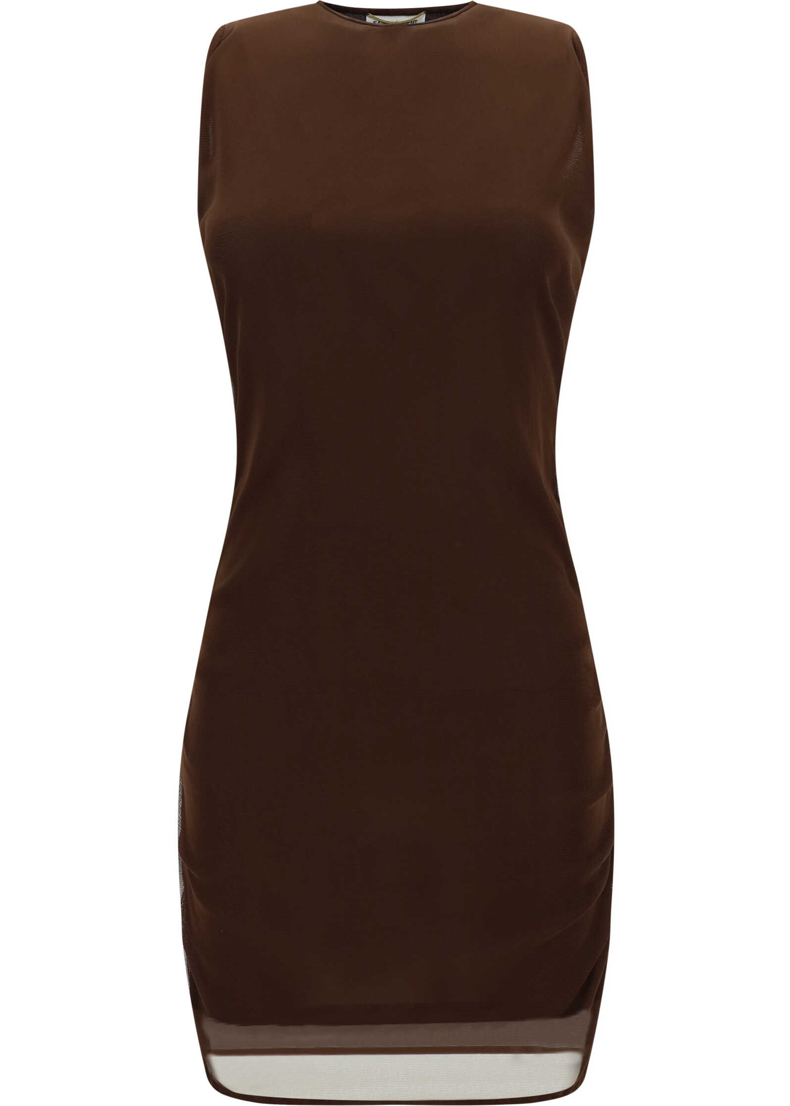 Mini Dress by Saint Laurent, semi-sheer stretch tulle design, sleeveless pattern, ruffle detail applied to skirt.