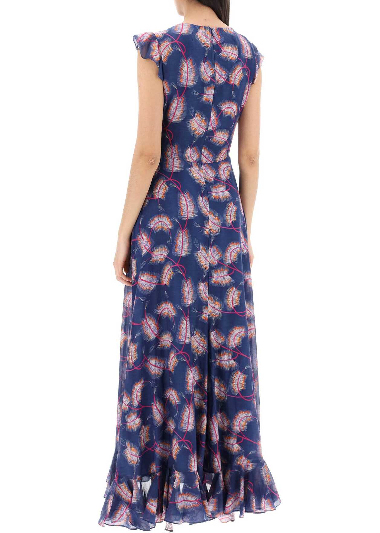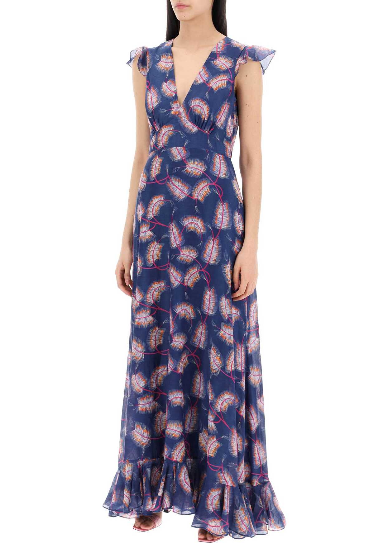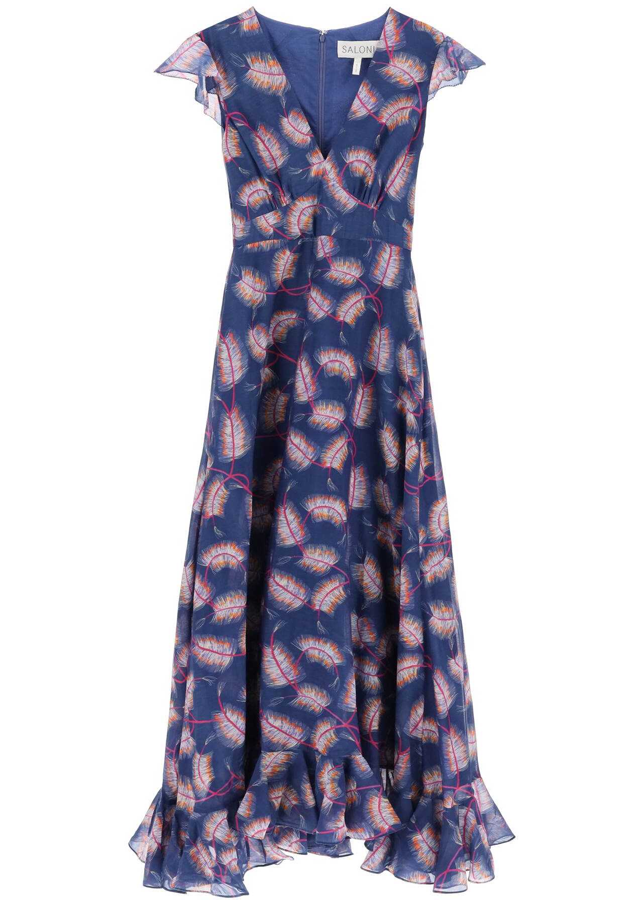 The Emma maxi dress by Saloni is made of cotton and silk voile, featuring an all-over print for a soft and fluid silhouette. It has a hidden zip closure at the back and a pure cotton slip underneath. The sleeveless design with flap detail showcases a V-neckline and ruffle hem. The model is 177 cm tall and wears a UK size 8.