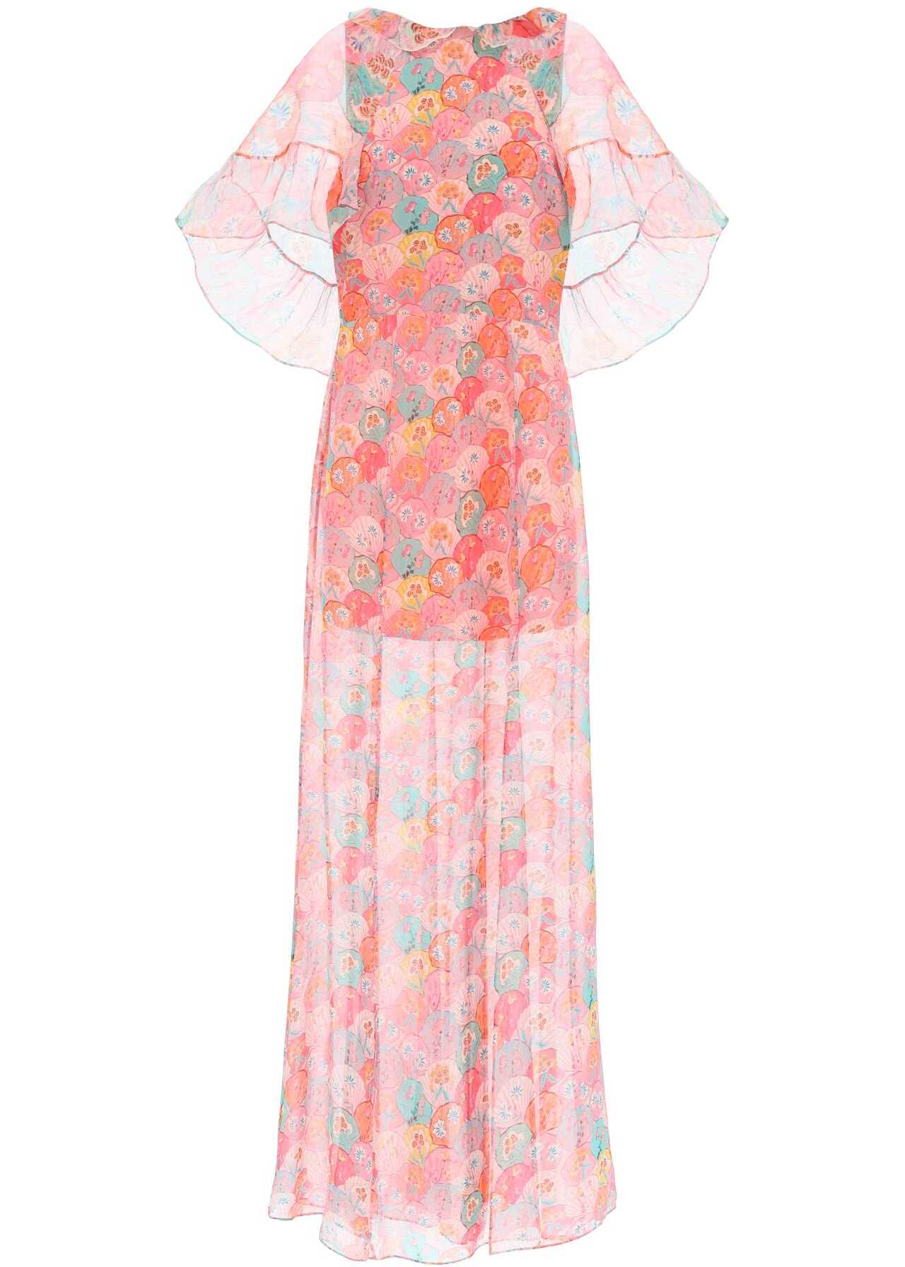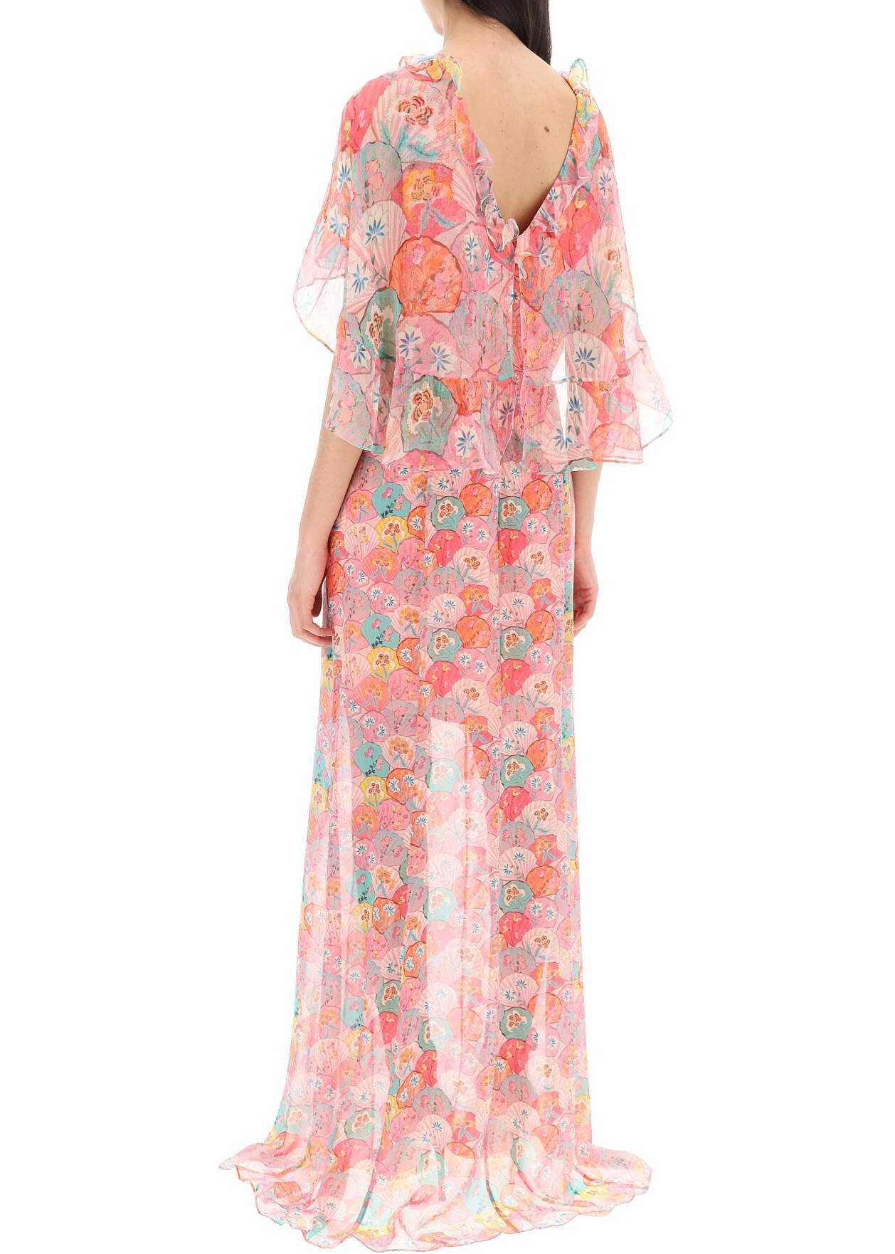 The Natalia maxi dress by Saloni is made of pure silk georgette with a shell and floral print all over. The design features short cape sleeves, a ruffled neckline, and a side slit at the bottom. It comes with an inner lining and a hidden back zip closure, creating a soft silhouette. The model is 177 cm tall and wears a UK size 12.