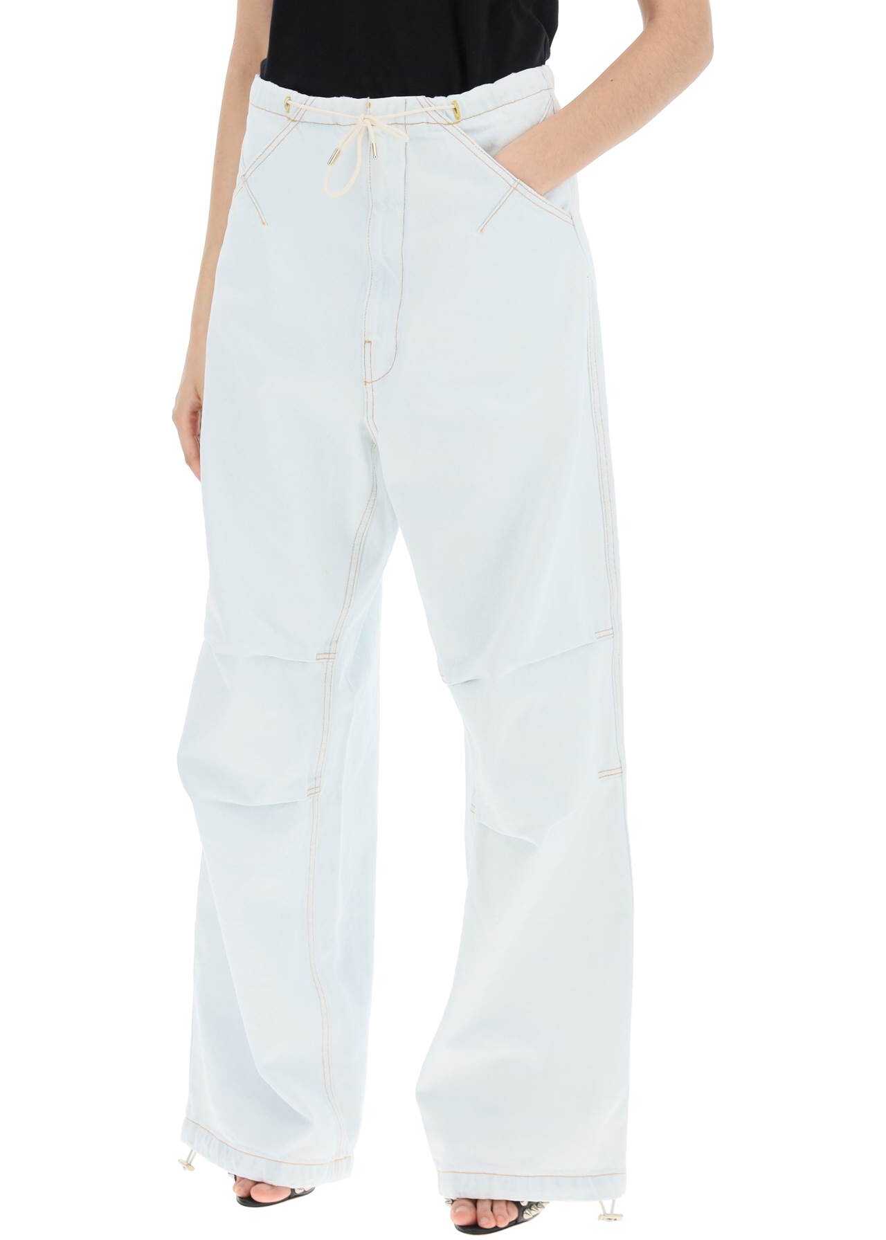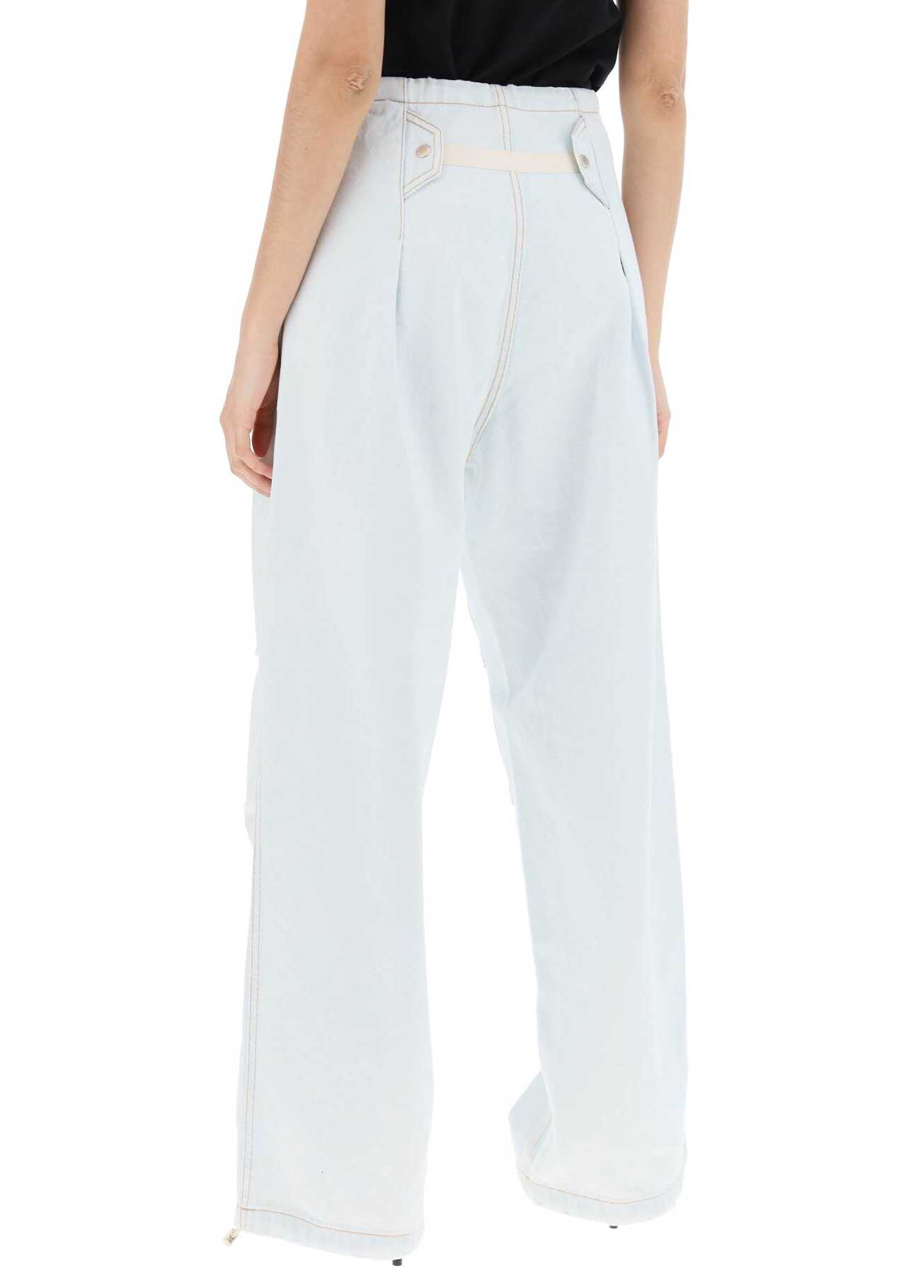 Darkpark jeans crafted in light-washed cotton denim with contrasting topstitching. They feature front slanted pockets, adjustable waistband and hem with drawstring and front closure with zipper fly and button. Flared cut with baggy fit enhanced by knee pleats. The model is 177 cm tall and wears size IT 38.