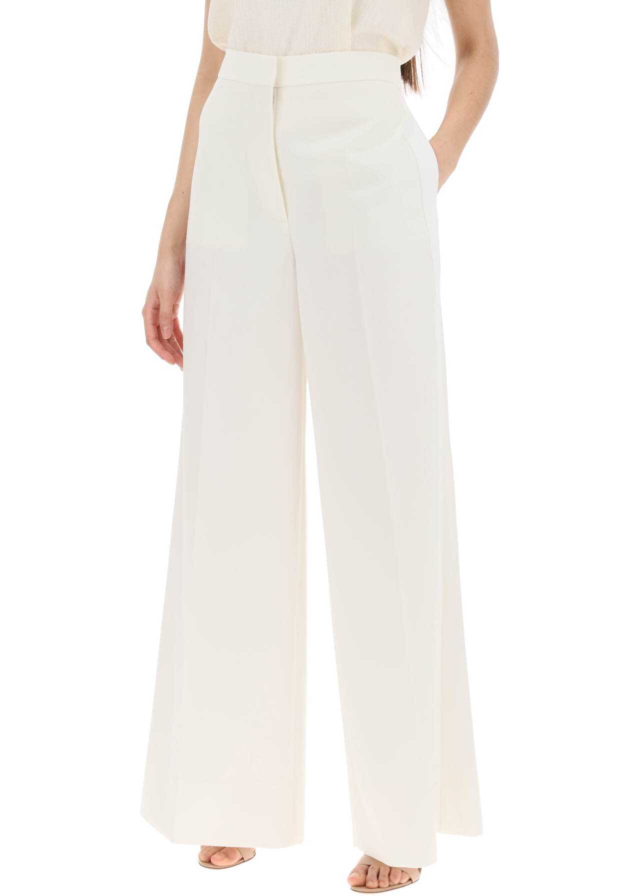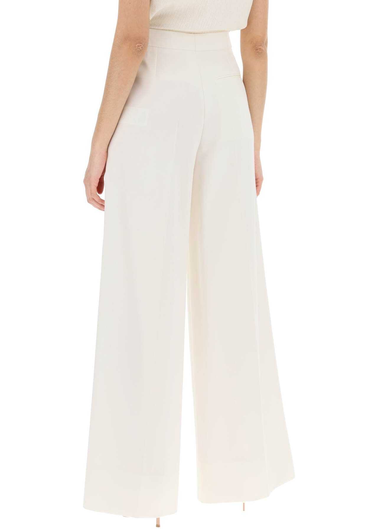 Stella McCartney tailored trousers made of responsibly sourced wool twill. The high-waisted design, with a wide leg enhanced by pressed pleats on the front and back, features side pockets inserted into the seams, belt loops, and a zip and hook closure flap. Adorned with contrasting white side stripes along the entire length. The model is 177 cm tall and wears size IT 40.