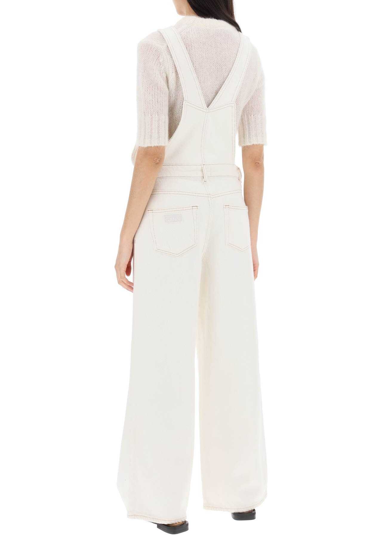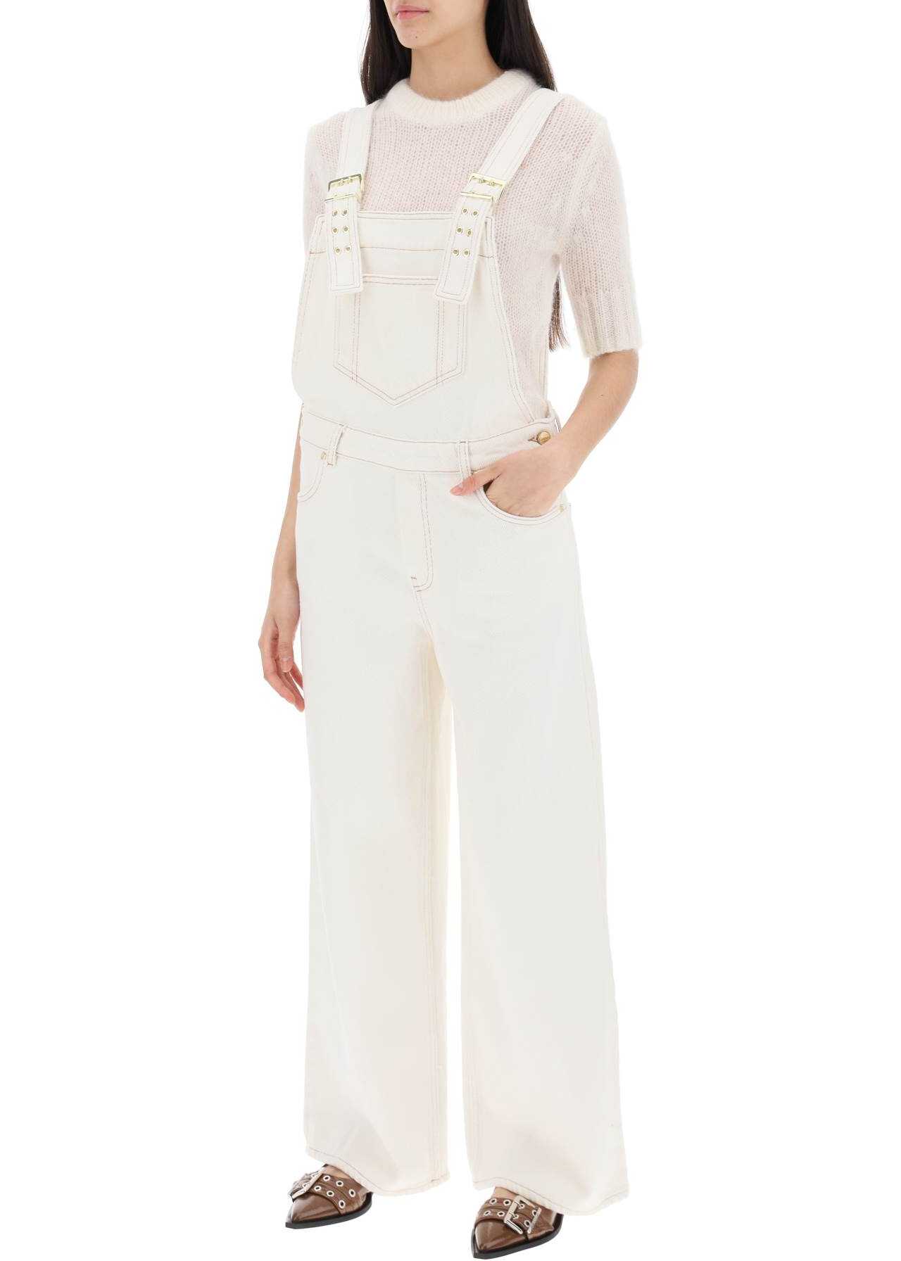 Ganni's overalls are made of heavy organic cotton denim with contrasting stitching. They feature adjustable straps with gold-finished metal buckles, a patch pocket on the chest, French pockets on the sides, and additional applied pockets on the back adorned with a fabric logo label. The design has a wide leg and relaxed fit. The model is 177 cm tall and wears a size EU 34.