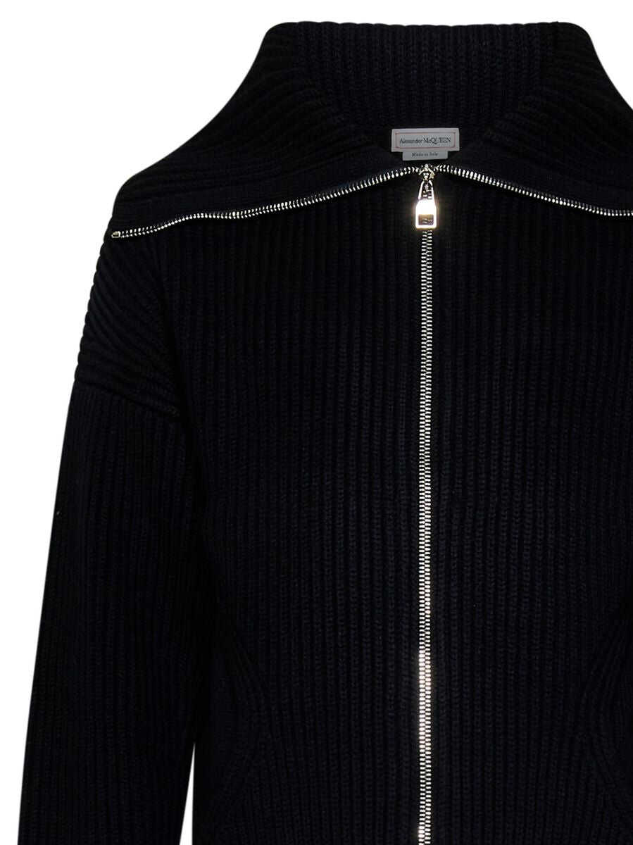 Black wool and cashmere blend cardigan from Alexander McQueen featuring long sleeves, front zip closure, ribbed hems and silver tone metal finishes.
