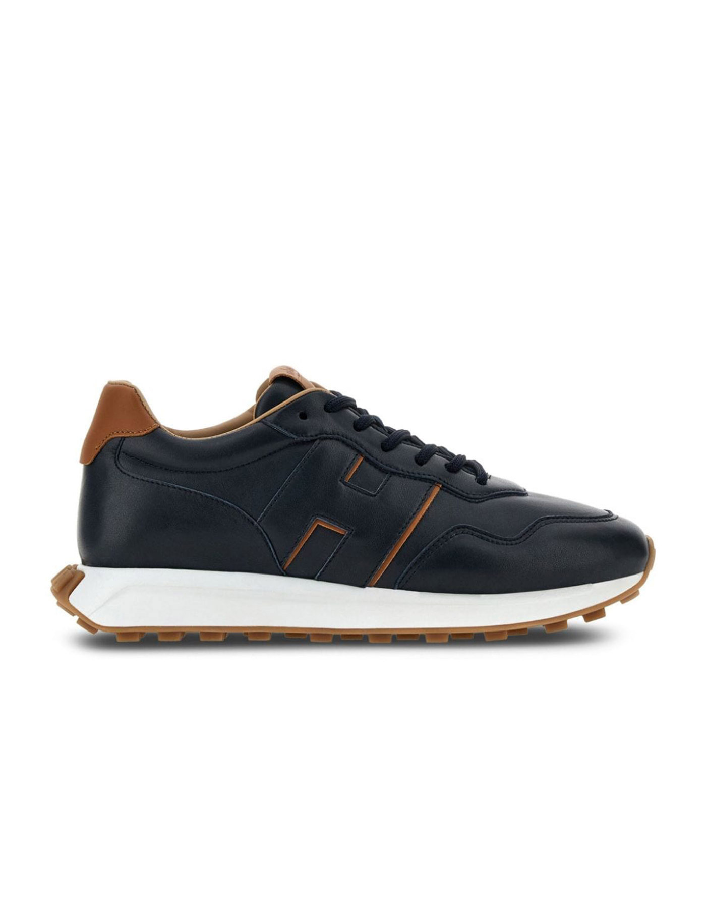 Hogan blue H601 men's sneakers in leather with tone-on-tone side logo, contrasting rubber sole, reinforced brown heel.