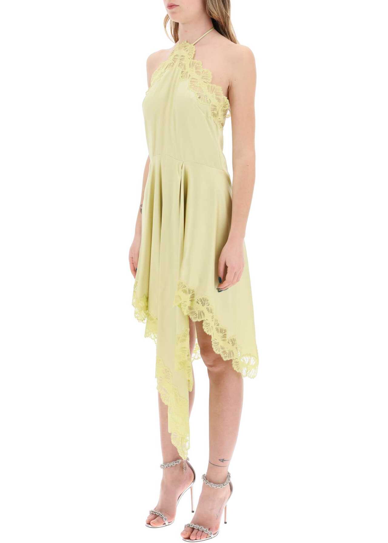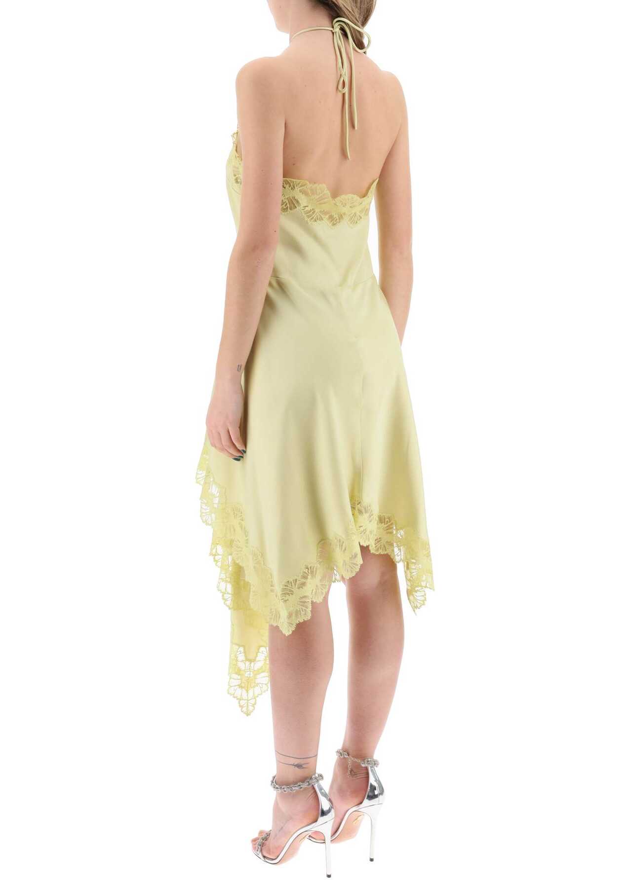 This short dress by Stella McCartney is made of sustainable technical viscose satin, featuring an asymmetrical design finished with tone-on-tone Guipure lace edges. It has a halter neckline with an open back and adjustable ties at the back of the neck, as well as a side closure with an invisible zipper. The silhouette is flared with a waist cut and draped skirt. The model is 177 cm tall.