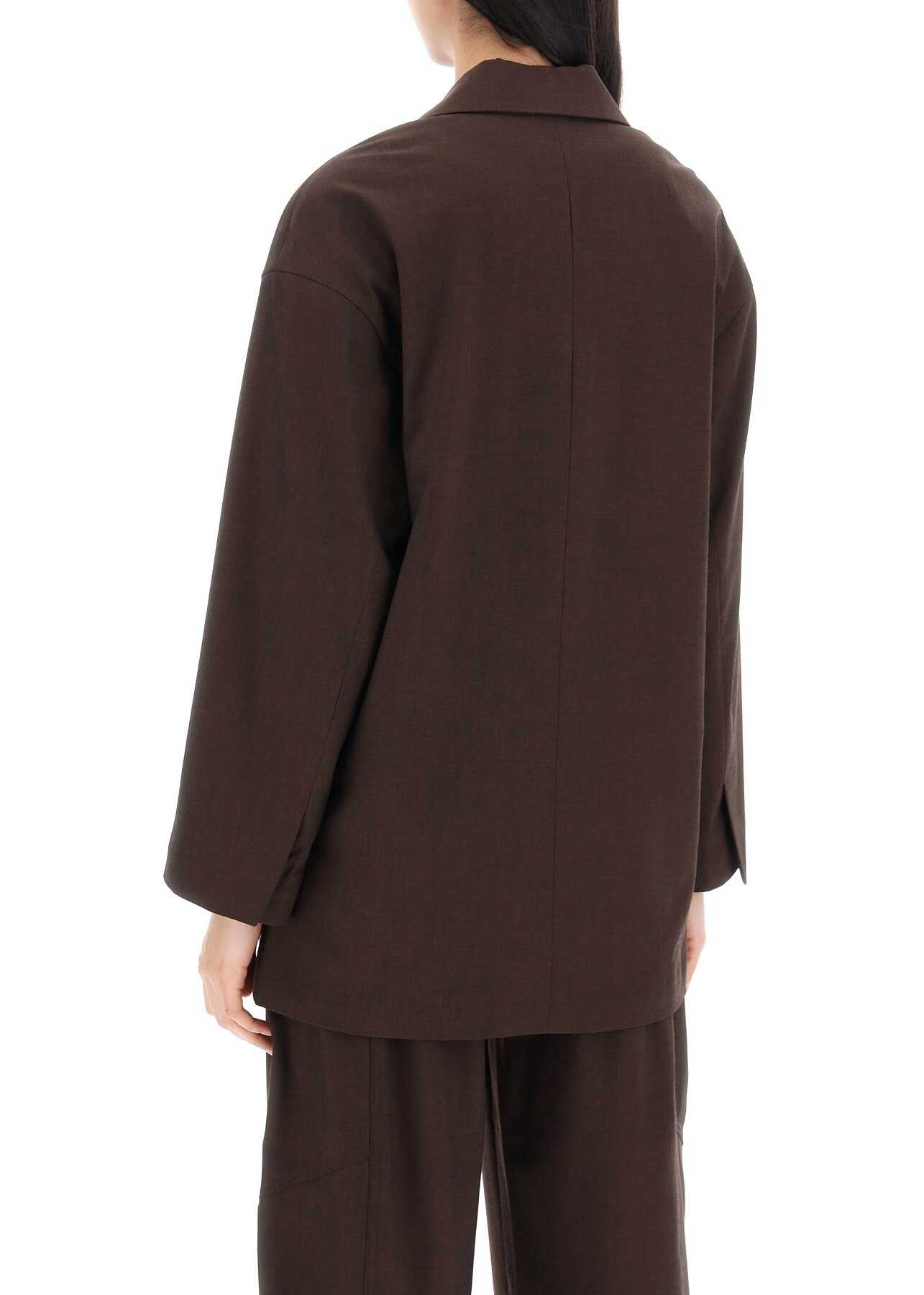 This Ganni drapey blazer features a boxy cut and is made from LENZING&trade ECOVERO&trade viscose, with a wide V-neckline and flap pockets. It is fully lined on the inside. The model is 177 cm tall and wears size 34.